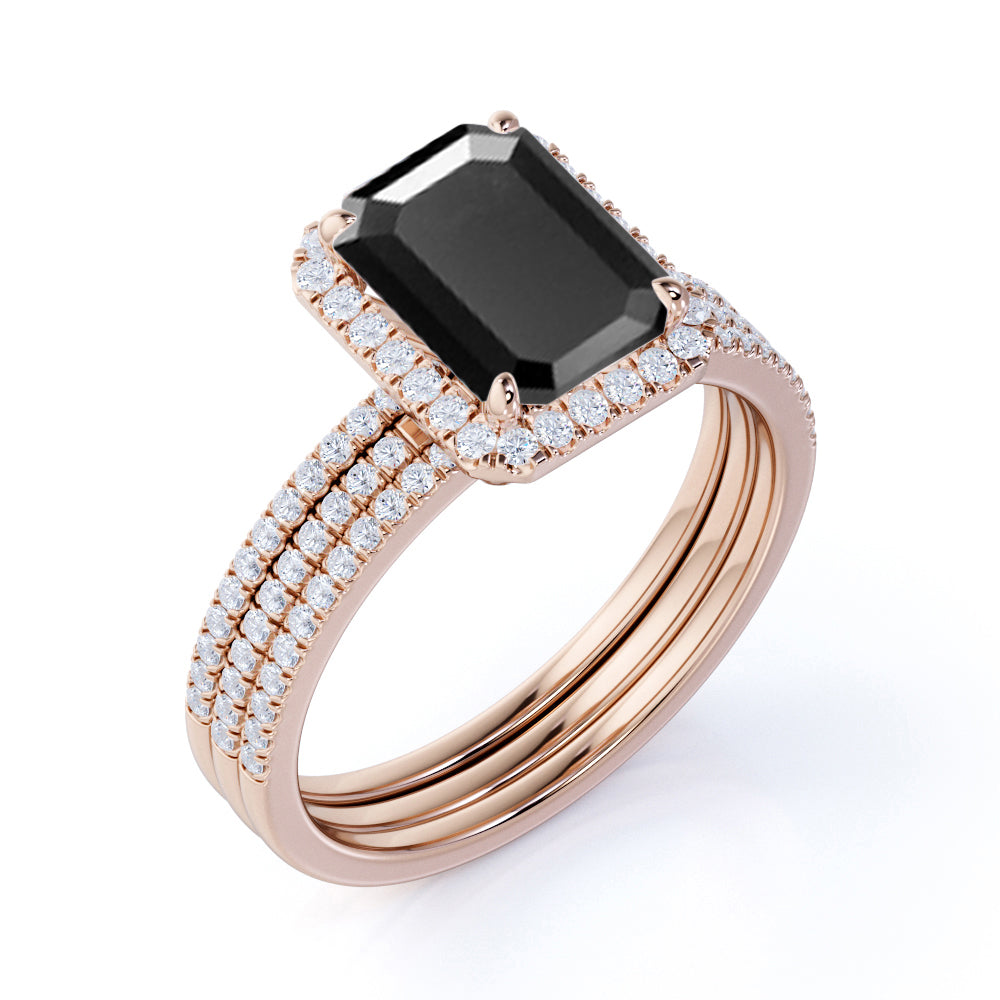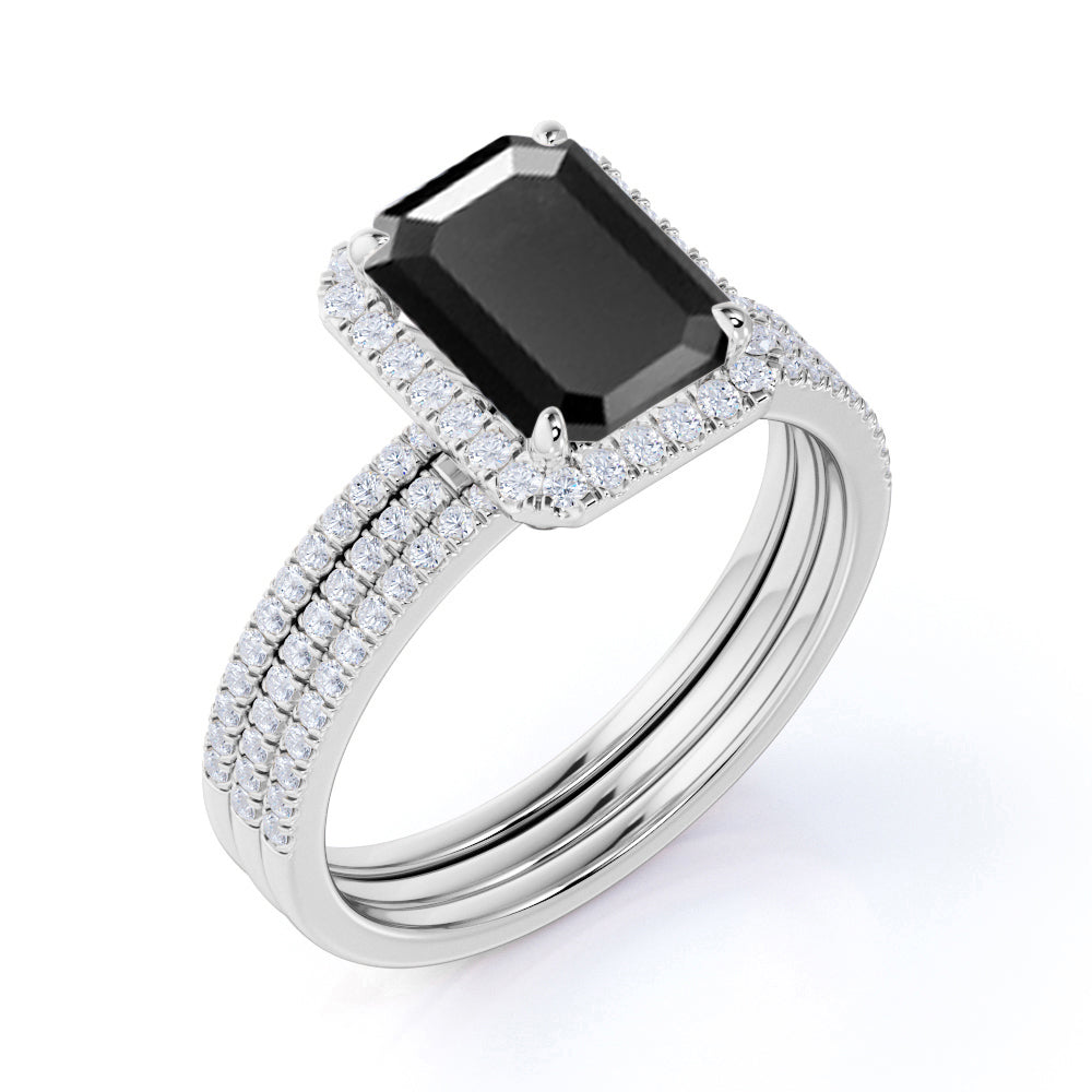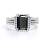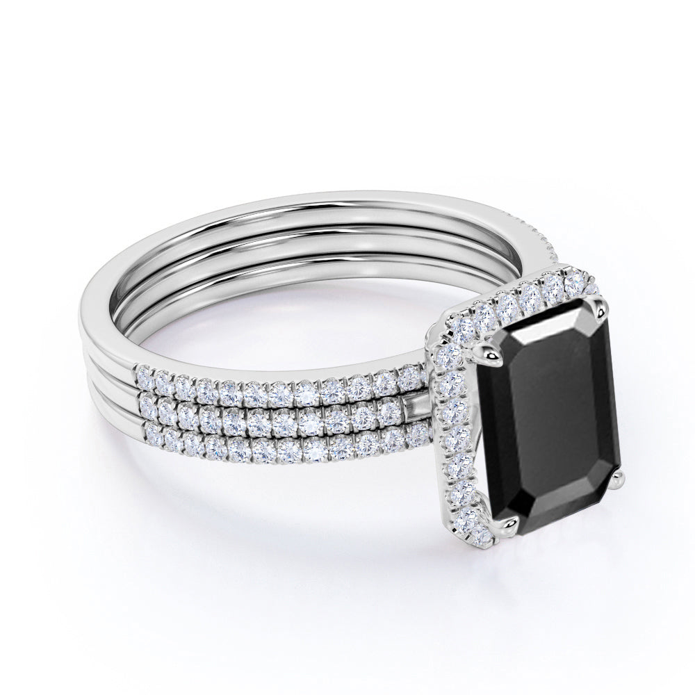 Bestselling 2 Carat Emerald Cut Lab Black Diamond Halo Trio Wedding Bridal Ring Set in White Gold
