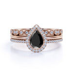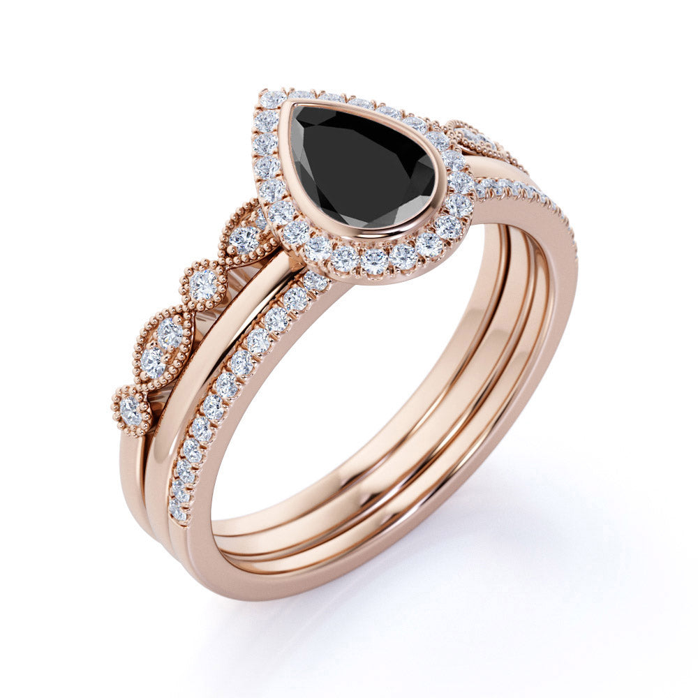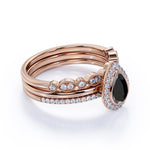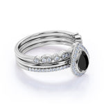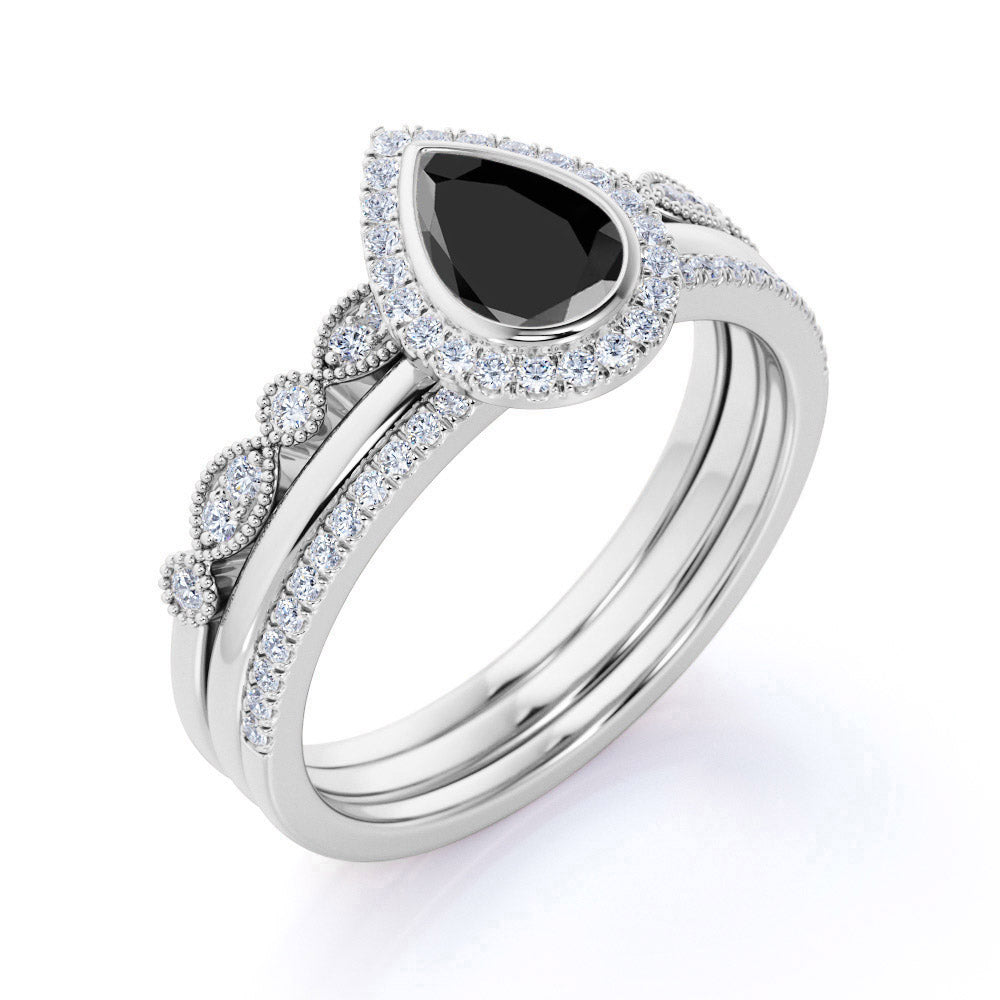 Bestselling 1.65 Carat Pear cut Lab Black Diamond Halo Trio Wedding Bridal Ring Set in White Gold