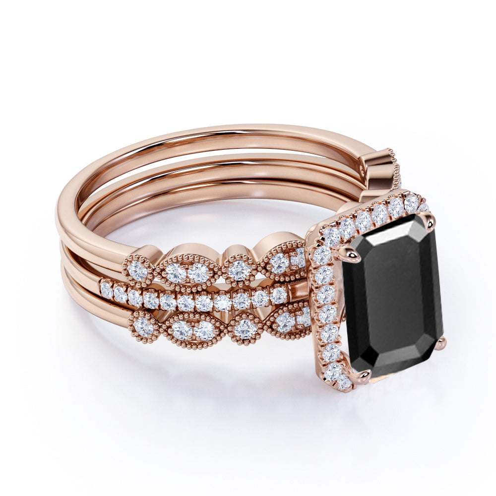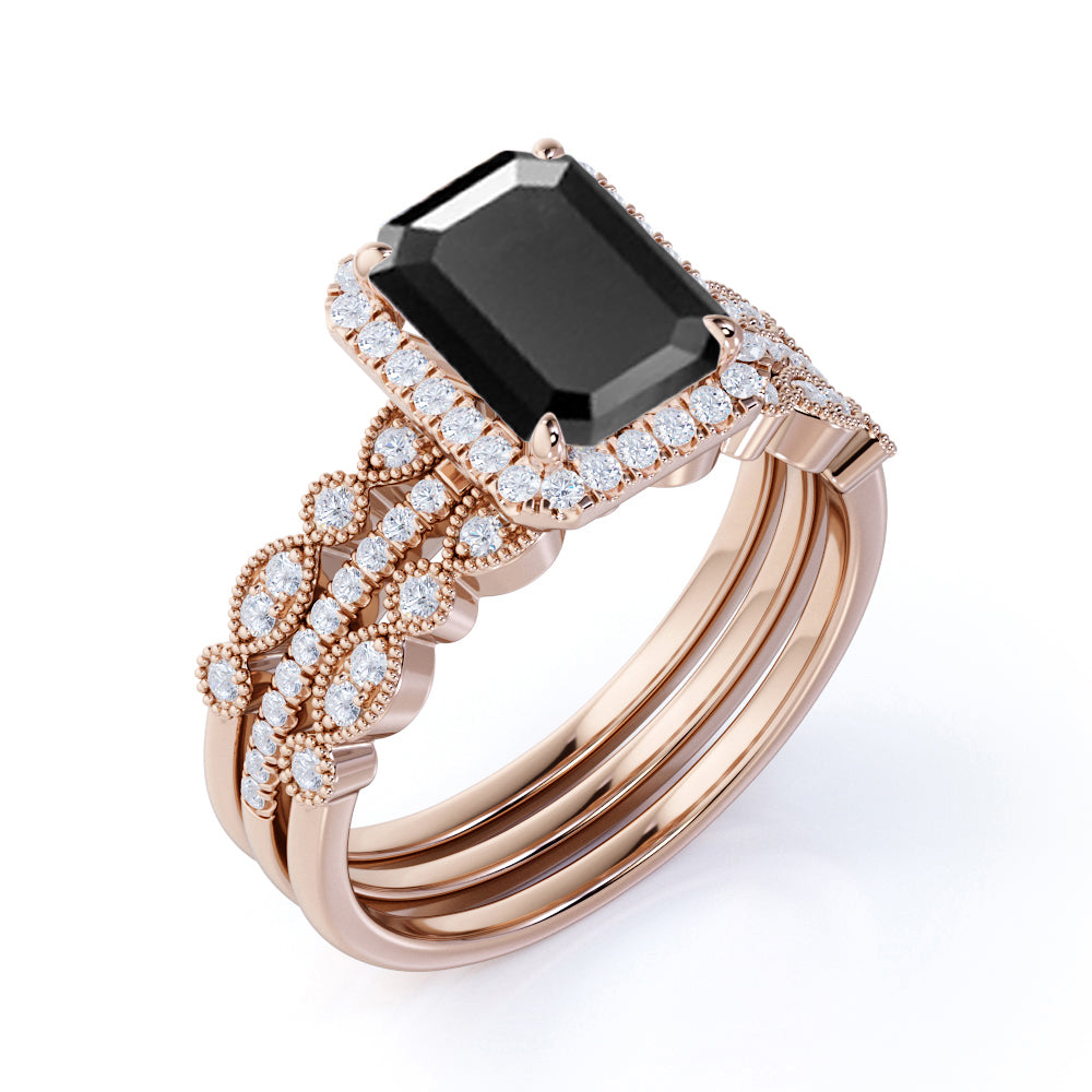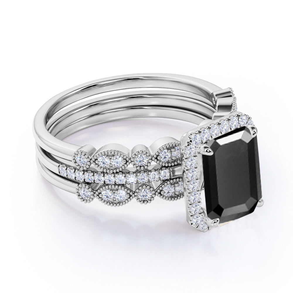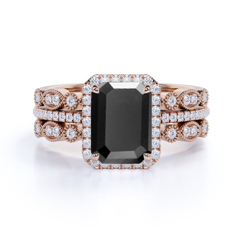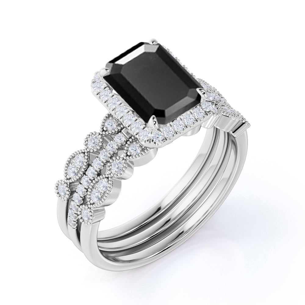 2 ct Trio Lab Black Diamond Vintage Wedding Ring Set