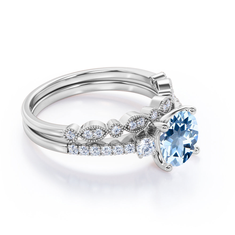 Bestselling 1.75 Carat Antique Design Round cut Aquamarine and Diamond Wedding Ring Set in White Gold. Fascinating sparkling aquamarine wedding ring set features 1 carat perfect real blue aquamarine and 0.75 carat glittering diamonds and is made in solid 10k White Gold. The beautiful wedding ring band is handmade and personalized by me or one of my other skilled jewelry associates with over 15 years of experience.