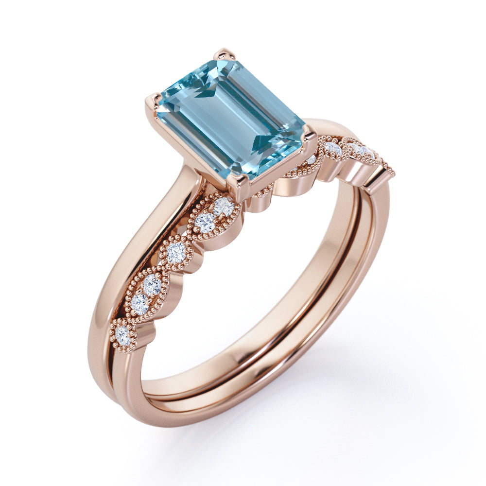 - The Aquamarine and Diamond Wedding Ring Set can be made in either 10k, 14k, or 18k real solid gold and in any color between Rose, White or Yellow.