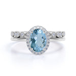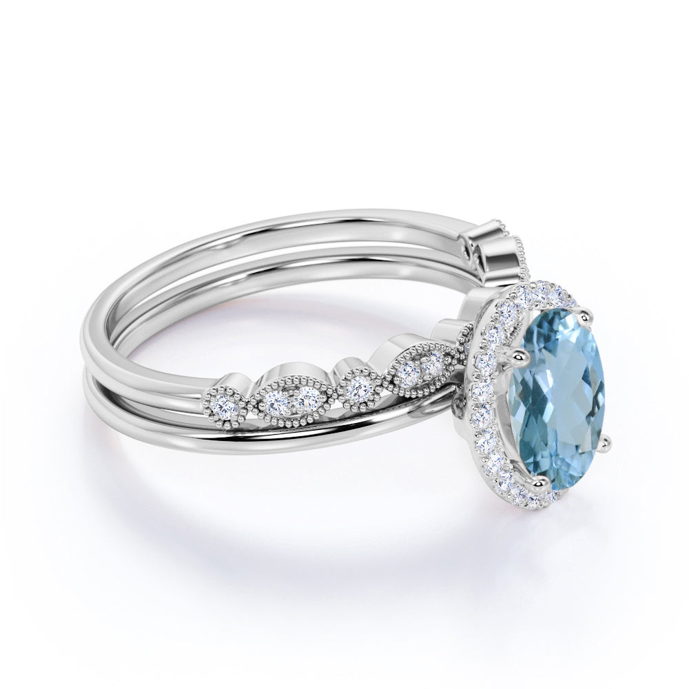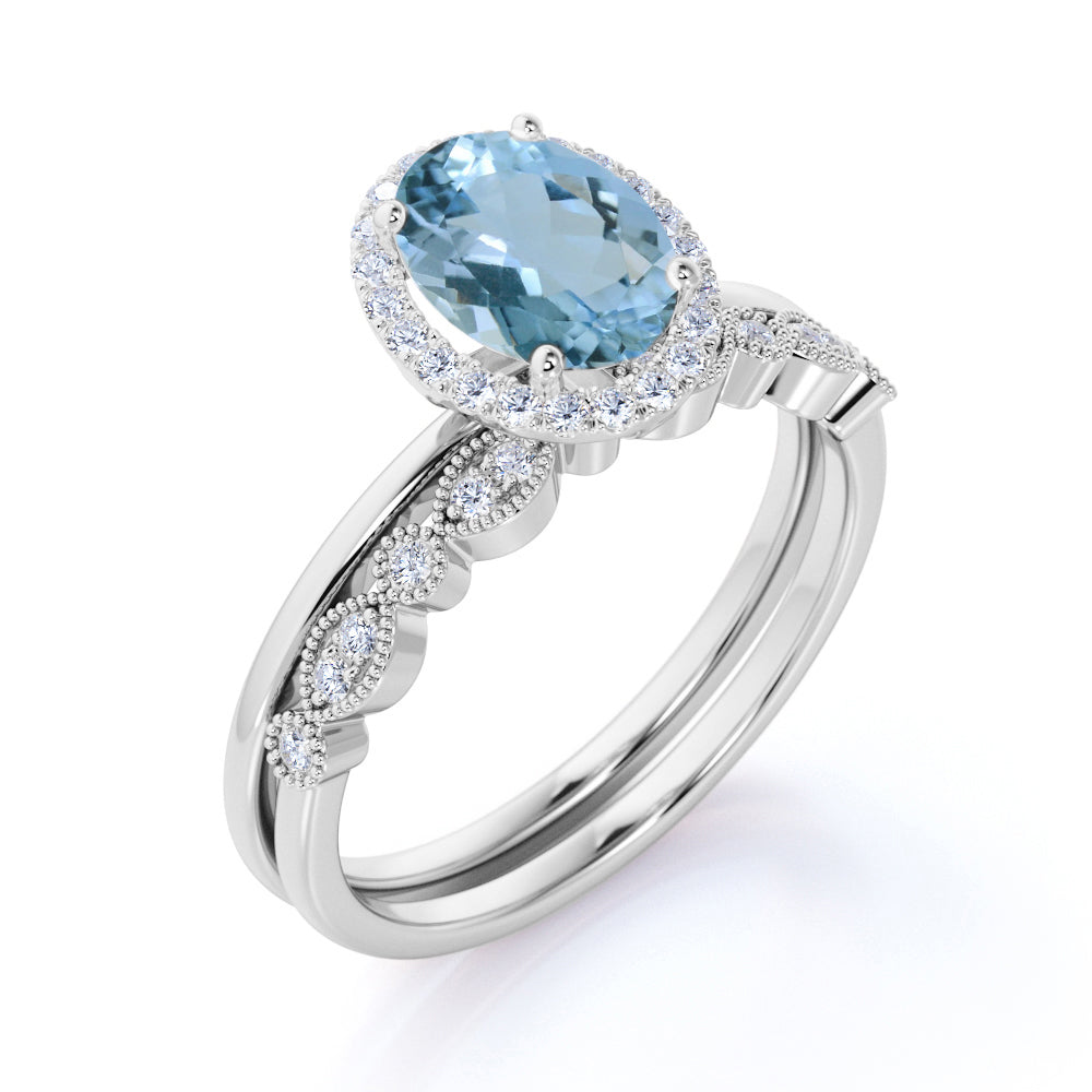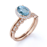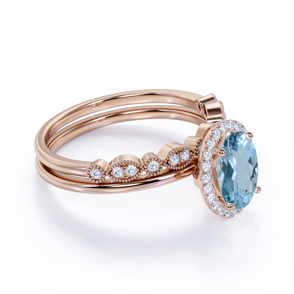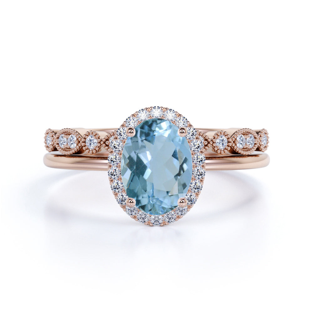 Antique Style 1.50 Carat Oval Shape Aquamarine and Vintage Semi Eternity Diamond Halo Bridal Wedding Ring Set in Rose Gold