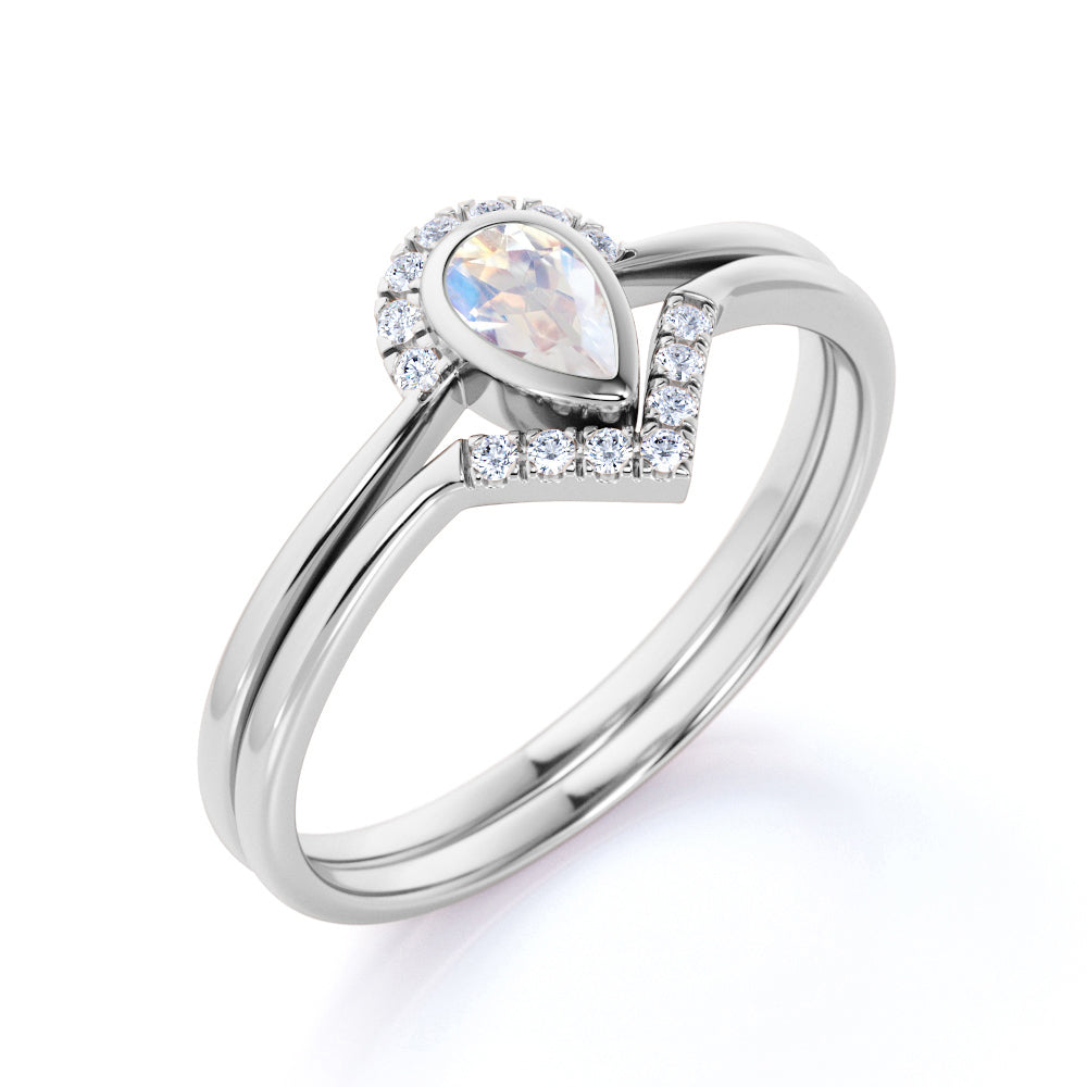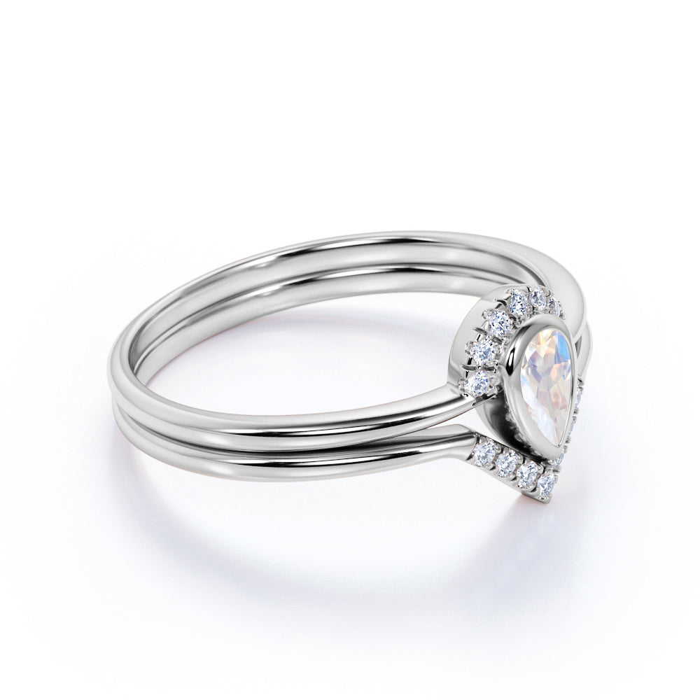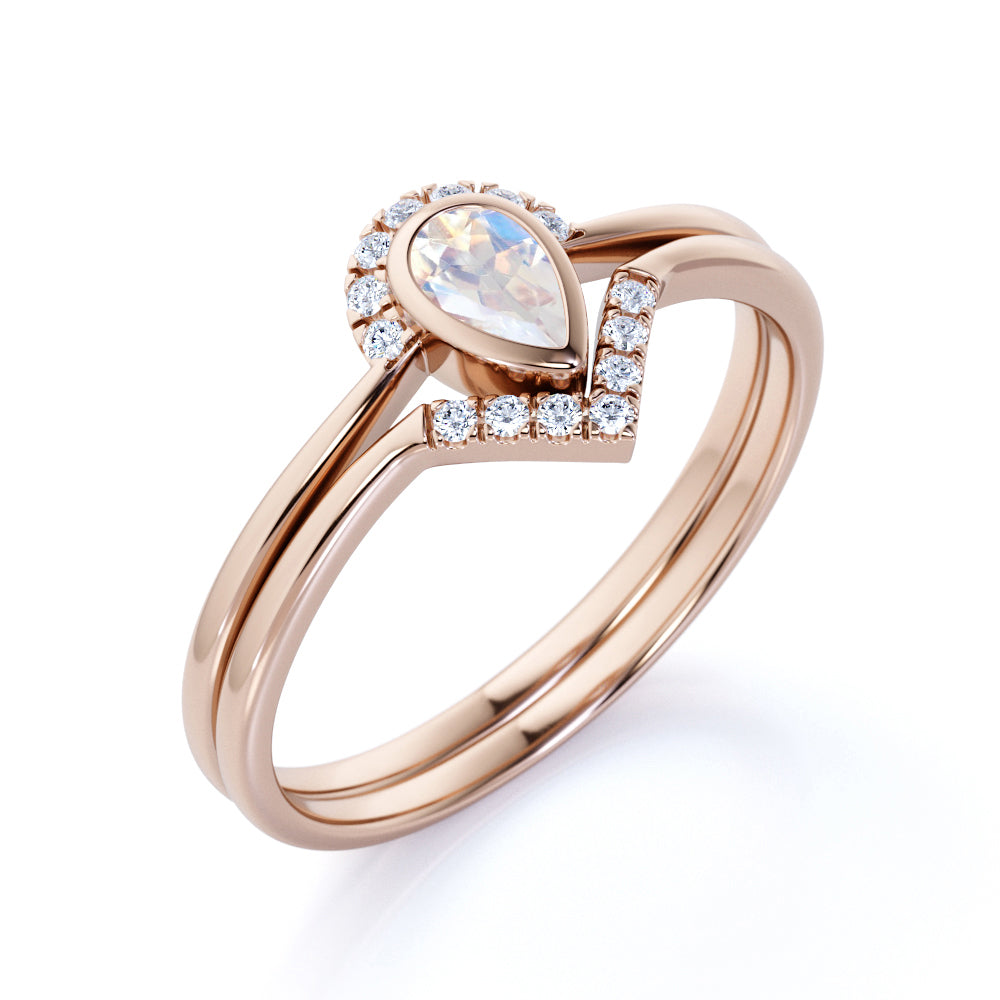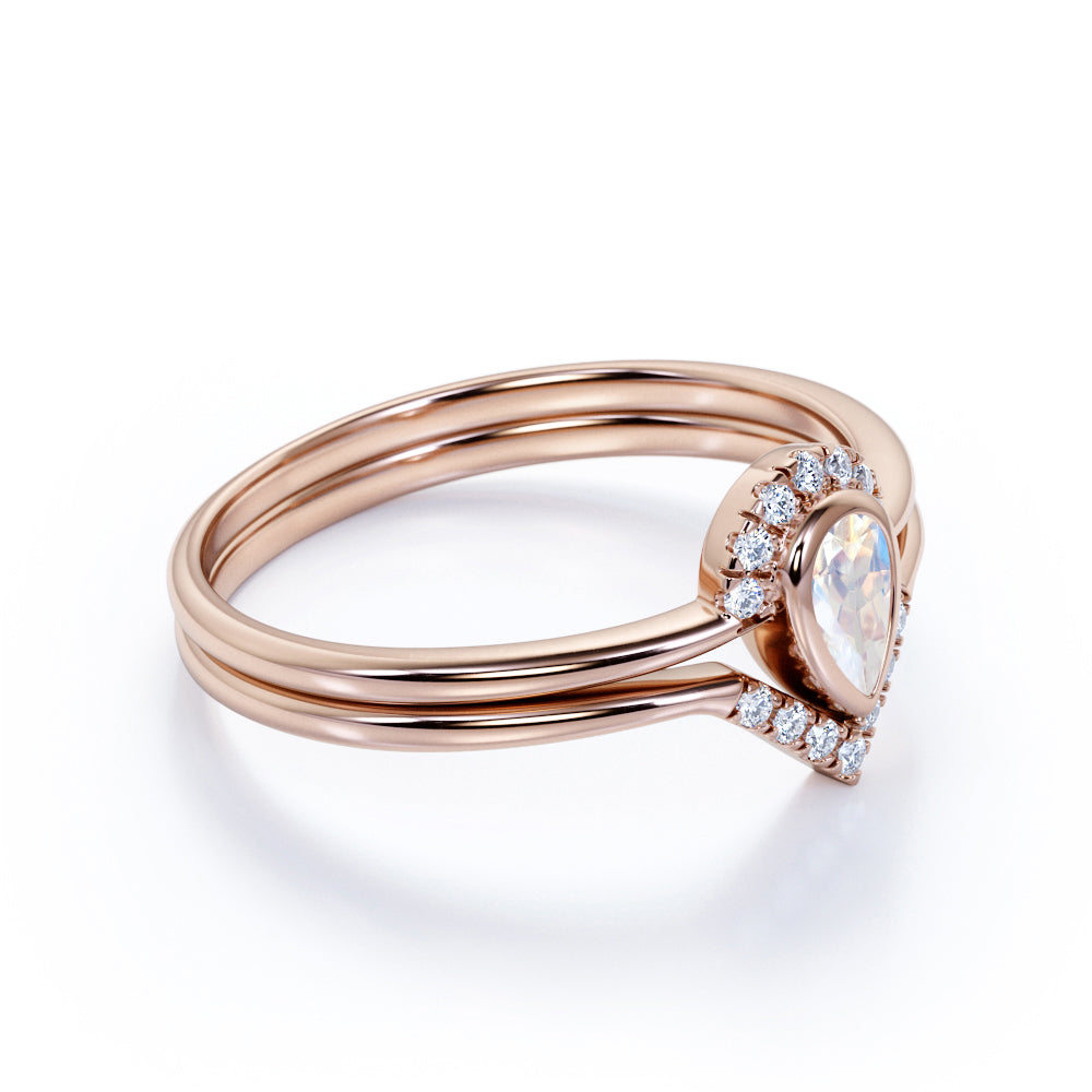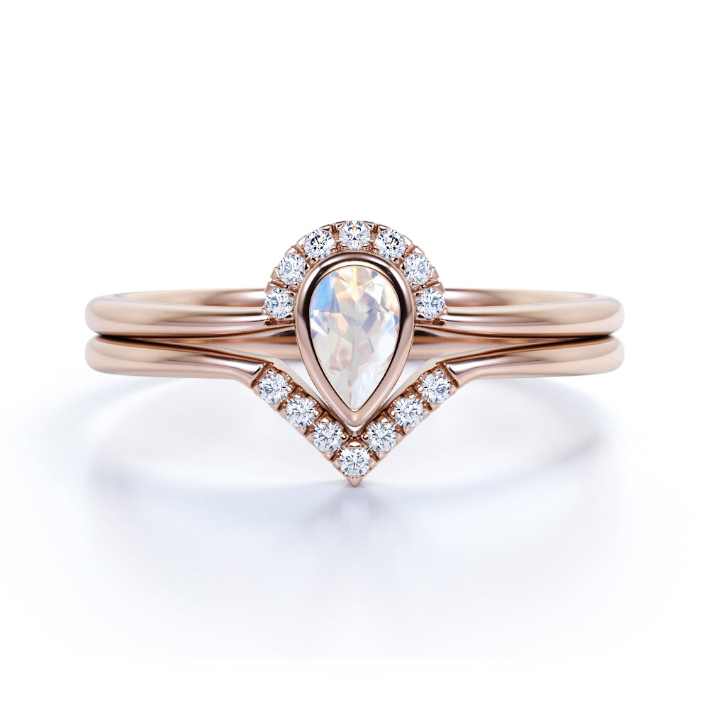 Bezel 1.75 Carat Almond Shape Rainbow Moonstone and Diamond Contour Wedding Set in Rose Gold