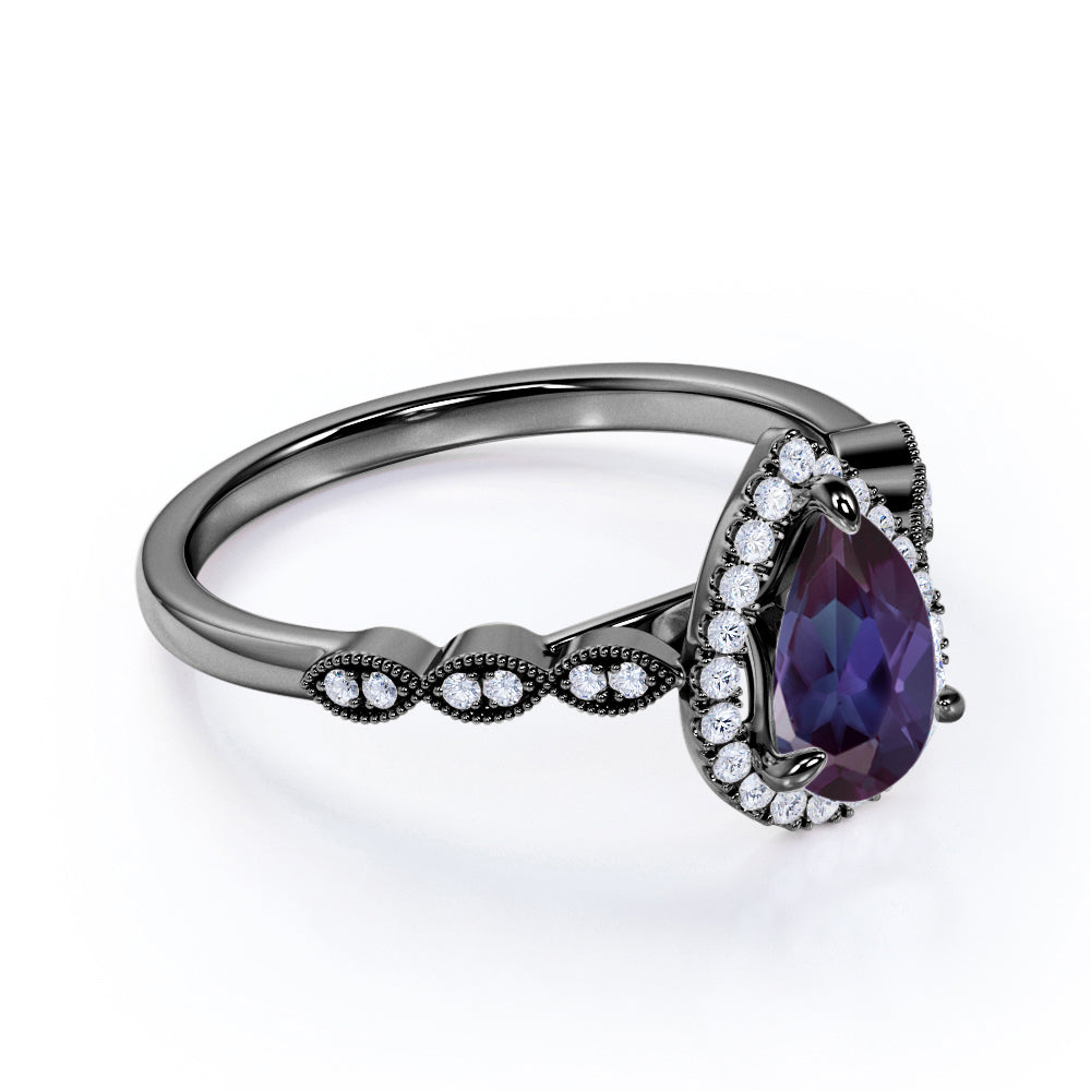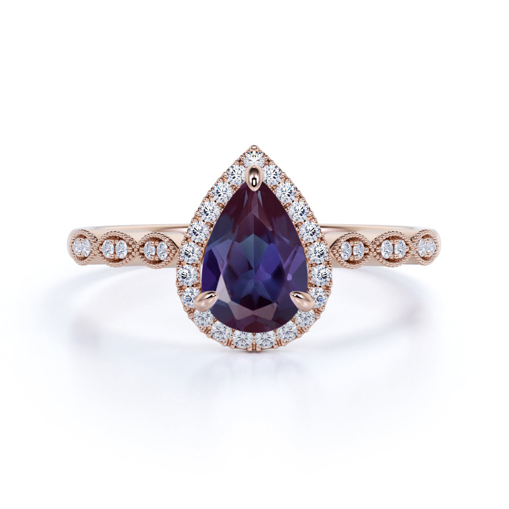 Be on cloud nine with this Bezel Halo 1.50 Carat Pear Shape Lab Created Alexandrite and Diamond Marquise Dot Art Deco Engagement Ring. This antique ring features 1 carat pear cut lab grown Alexandrite and .50 carat real genuine side diamond for gold ring and moissanite for silver ring. This classic engagement ring can be customized to either 10k, 14K and Gold over Silver and either Black Gold, Rose Gold, White Gold or Yellow Gold. Also, as your satisfaction is our most priority, we will do our best to have your handmade jewelry be carefully and beautifully crafted by our expert jewelers. The order also comes with a 30-day full refund policy. Crowned as June birthstone, this flawless synthetic Alexandrite ring will bring hope as well as encouragement to you. Being one of the rarest gemstones in the world, this ring will create a charming and fascinating look on your fingers. This flawless ring will be a perfect fit for you love story as it is believed that joy enters the lives of people through the stone. Enrich your charming love story and strengthen your bond with this color-change man made Alexandrite ring. This simulated Alexandrite ring gives a vivid grass green color in daylight and displays an intense raspberry red in candescent light. This flawless simulated Alexandrite ring will be a perfect match for those who are looking for beautiful, classic, vintage and antique synthetic Alexandrite pieces of fine jewelry. This ring will bring love and hope to its wearer. This engagement ring will create a timeless and fabulous look on your finger. Sparkle your finger with this mystic lab made Alexandrite ring which is perfect for any occasion and everyday wear. It is the perfect match for those who are looking for a remarkable gemstone rings as Alexandrite embodies their own unique color-change ability and uplifting meaning.