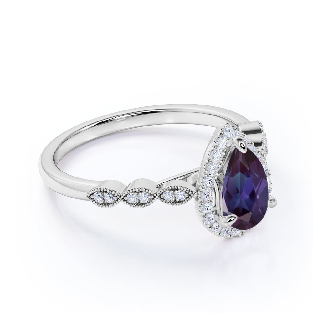 Bezel Halo 1.50 Carat Pear Shape Lab Created Alexandrite and Diamond Marquise Dot Art Deco Engagement Ring