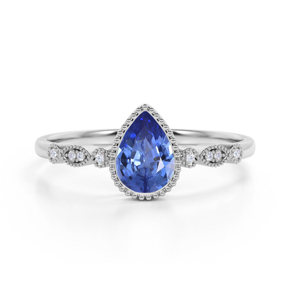 The wait is over for those women who are tired of those crazy details which is not necessary for your engagement ring, this minimal blue sapphire ring is the best for you. The antique style blue sapphire ring is very famous worldwide and this design is one of our bestselling. This sapphire ring features an approximately 1 carat pear cut natural sapphire, surrounded by .25 carat genuine side diamonds, for a total weight of 1.25 carats.