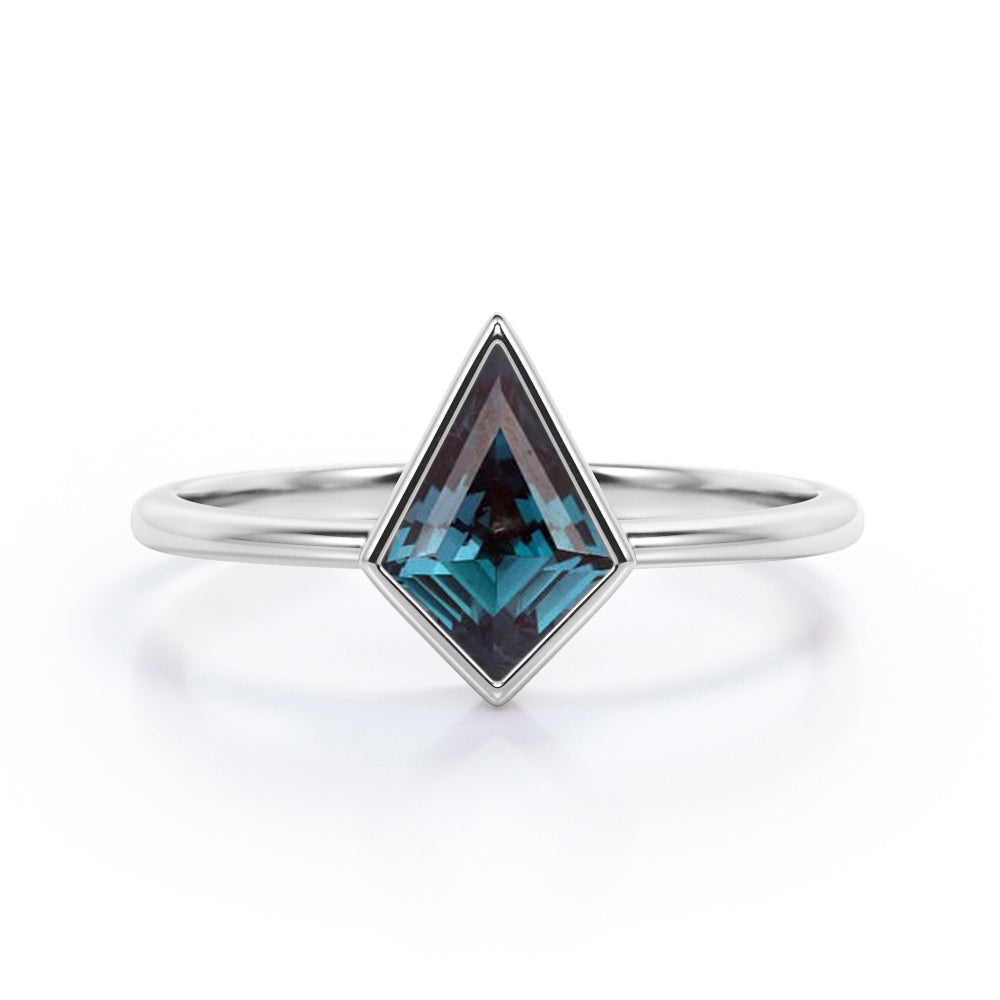 Bezel Set 0.85 Carat Kite Shaped Lab Created Alexandrite Solitaire Engagement Ring In White Gold