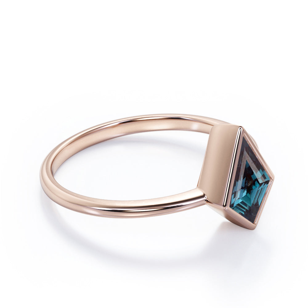 Bezel Set 0.85 Carat Kite Shaped Lab Created Alexandrite Solitaire Engagement Ring In White Gold. Not all engagement rings require gems and jewels. This understated design is oh-so chic without the adornments of glittering stones. Create a fascinating look on your finger with this kite shaped lab grown luscious teal purple alexandrite engagement ring of 0.85 carat. Its solitaire design feels utterly timeless and classic. The bezel set alexandrite at the center radaites deep jewel tones on its own. All our products are handmade with utmost love and detailed attention by our well-experienced craftsmen to satisfy your expectations. Subtle yet striking, this bezel set 0.85 carat kite shaped lab created alexandrite solitaire engagement ring can also be customized to 18k Gold plating over silver, 10k Gold or 14k Gold as per your preference. So what are you waiting for? Press add to your cart button now and make this alluring engagement ring all yours.