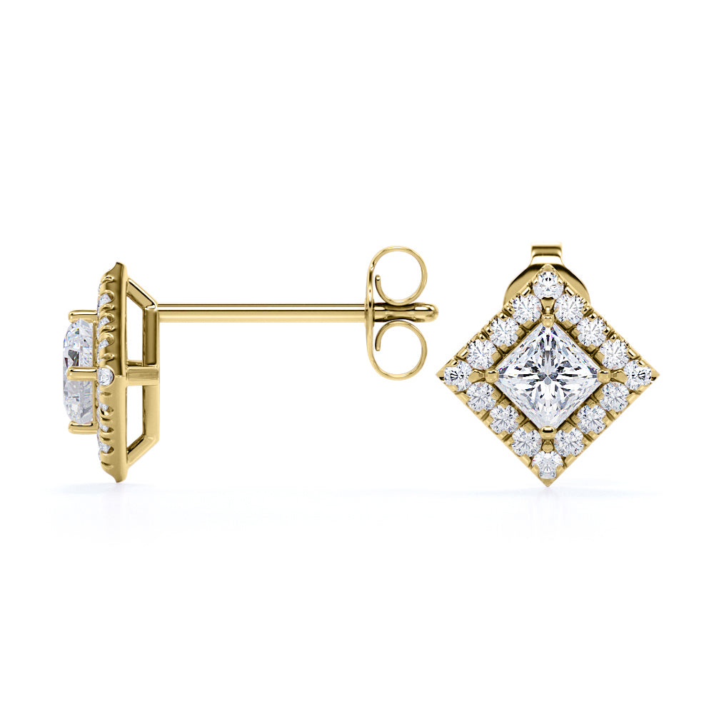 Bezel Set French Pave 1.10 Carat Princess Cut Certified Moissanite and Diamond 4 Claw Ear Studs for Women in Yellow Gold