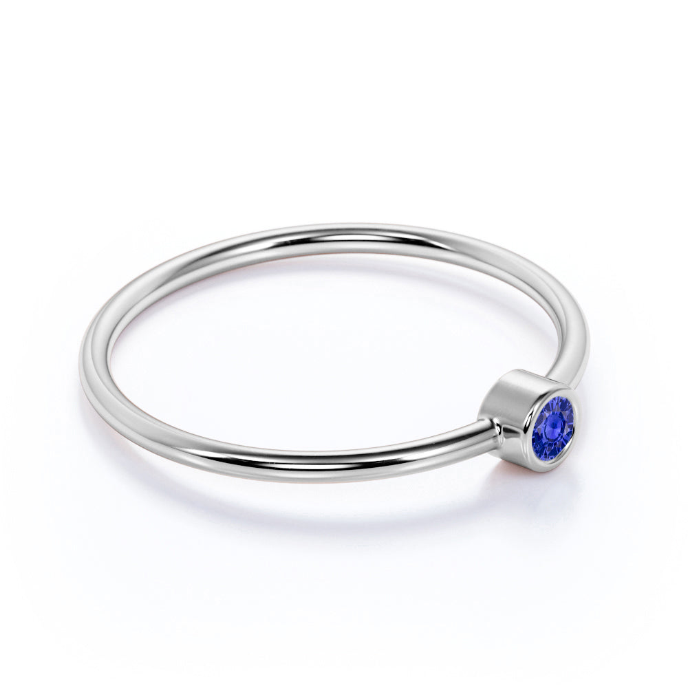 This midnight blue Lab-Created sapphire engagement ring band is so durable and therefore, you can use it everyday and rely with this amazing blue sapphire daily wear engagement ring band. This blue sapphire ring is on sale, but for a limited time only and prices may increase anytime. So what are you waiting for, buy her the most affordable ring and yet uses conflict free and authentic diamond. The bezel set blue Lab-Created sapphire is made for quality and secured mounting of any gemstone. Unique, vintage and the quality you can trust. This dainty blue sapphire ring features an approximately 0.15 carat round cut Lab-Created blue sapphire.