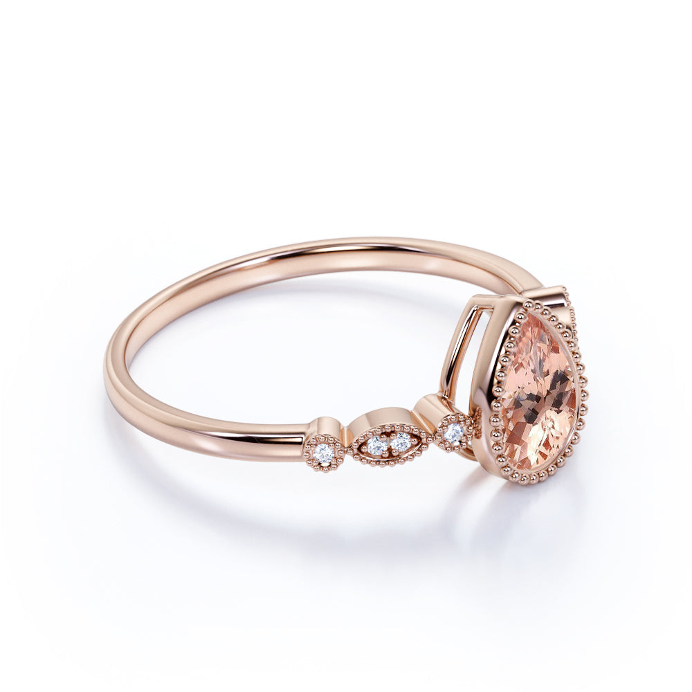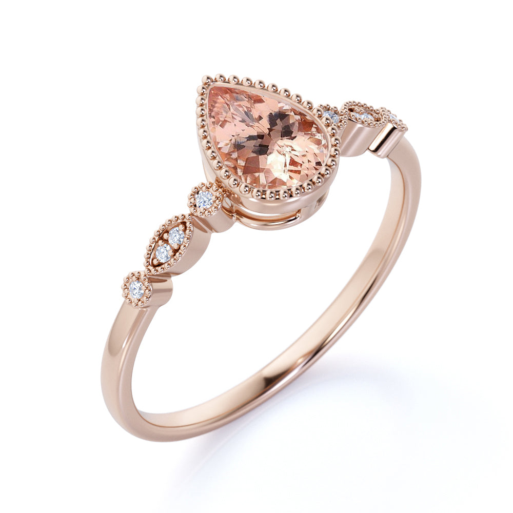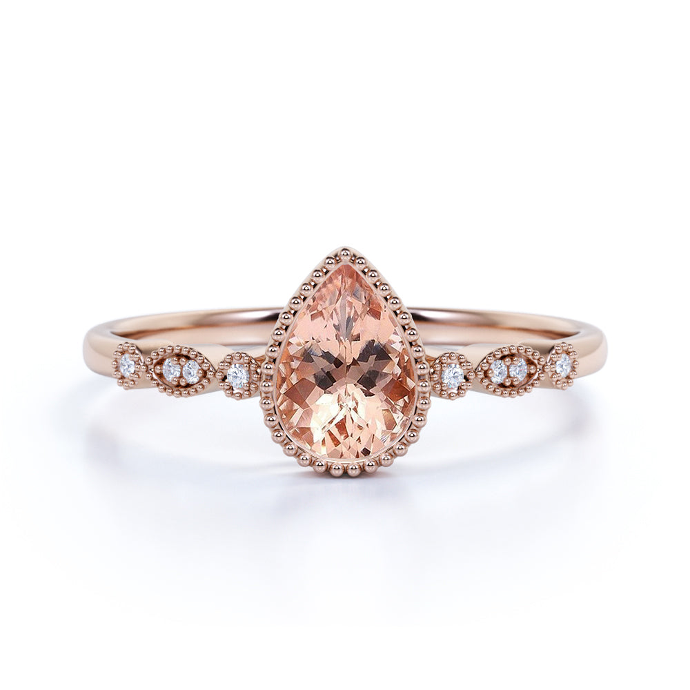 Bezel Set Set 1.25 Carat Pear Champagne Morganite and Diamond Unique Milgrain Engagement Ring in Rose Gold