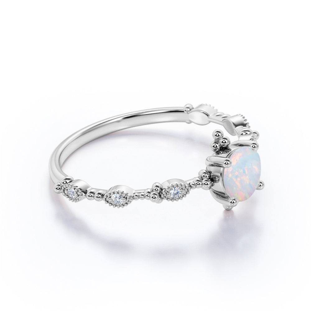 The Half Bezel Setting 1.05 Carat White Lab Created Opal Vintage Engagement Ring in White Gold has a mesmerizing colors that plays inside and currently one of the most trending gemstone in the market, especially for engagement ring. This faceted White Lab Created Opal engagement ring and luminous colors when viewed from different angles. This Lab Created Opal engagement ring features an approximately 1 carat round cut White Lab Created Opal in the center of the engagement ring.