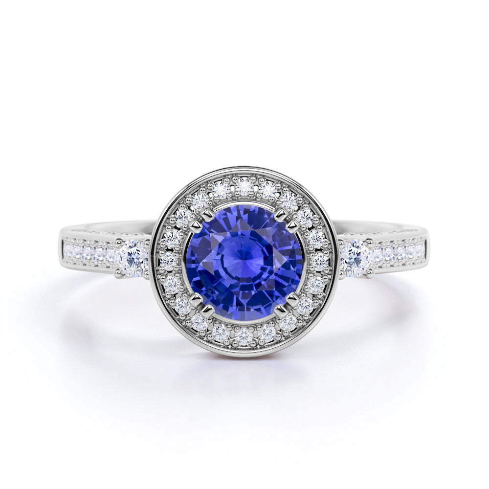 Big 0.75 Carat Round Cut Sapphire and Diamond Engagement Ring in 10k White Gold