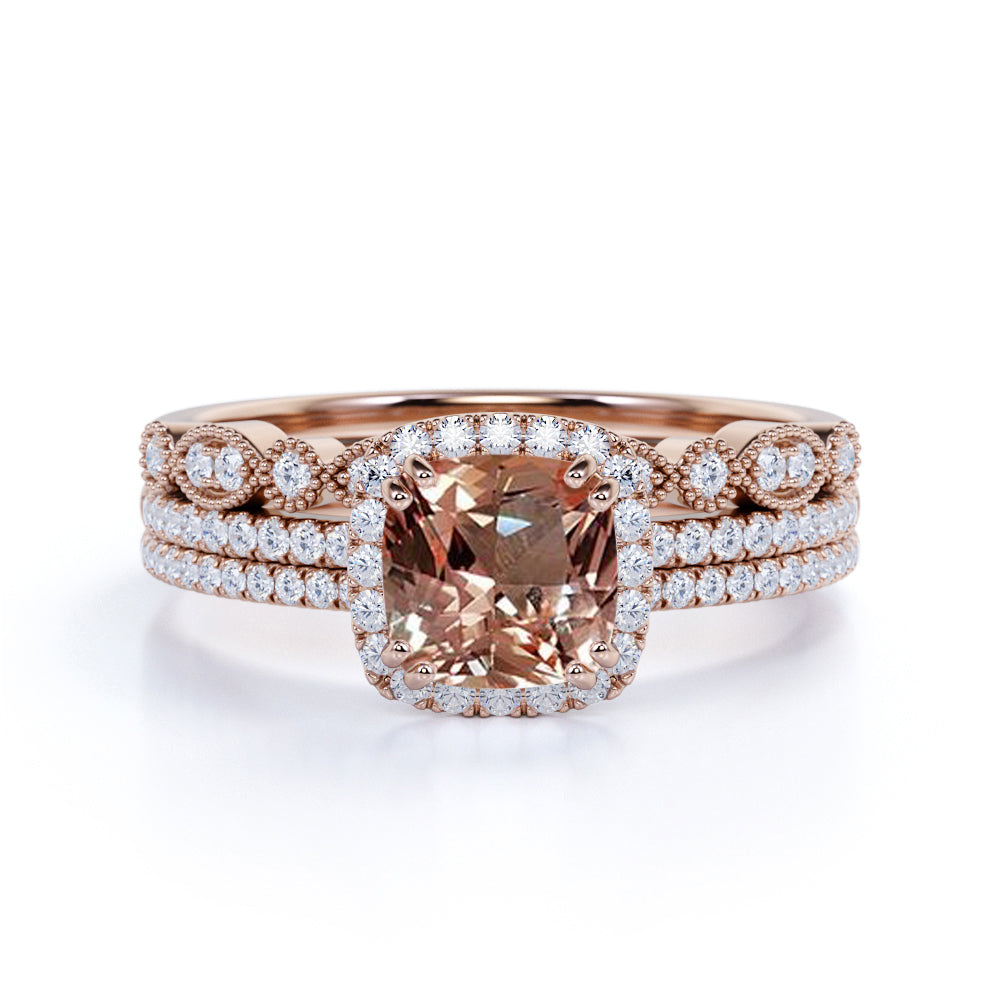 Halo 2 ct Cushion Morganite Vintage Trio Wedding Ring Set