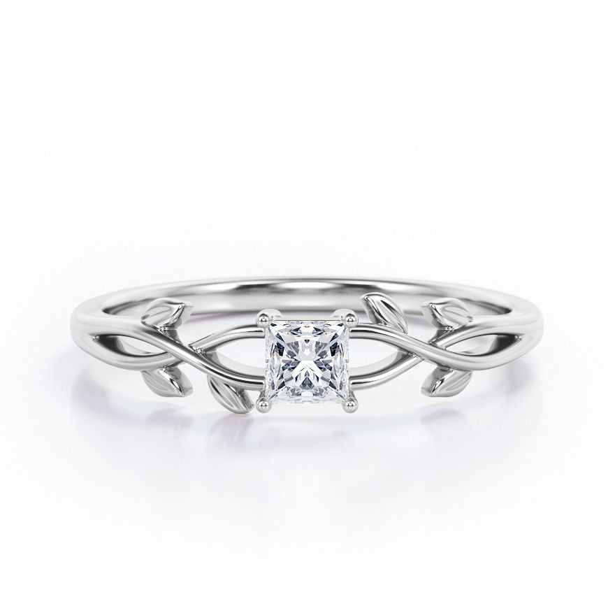 Adorn her finger with the Botanical Design 0.5 TCW Princess Cut Certified Lab Diamond Solitaire Engagement Ring in White Gold. Expertly hand-cut into a stunning princess shape, this ring features a total of 0.5 carats of dazzling Certified Lab Diamonds and Moissanite set on a solid white gold band. Its distinct design is perfect for those who appreciate unique and sophisticated jewelry. The brilliance and clarity of this ring will make it a standout piece in any collection. Ideal for expressing love and dedication, this elegant ring is a wonderful choice for engagements or special gifts. It can be customized in 10K, 14K, or 18K gold, available in white, rose, yellow, or black. The order includes a 30-day full refund policy, 30-day free resizing, and a 6-month warranty.