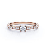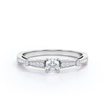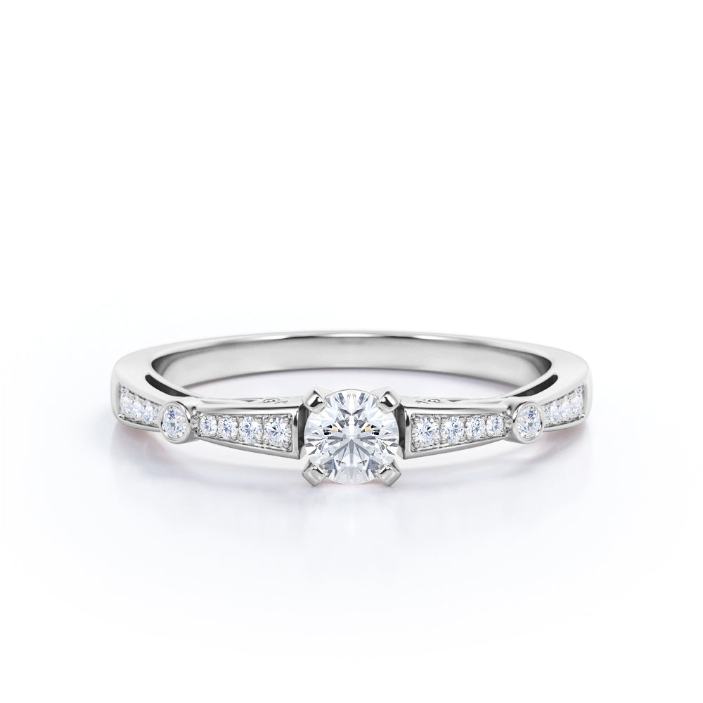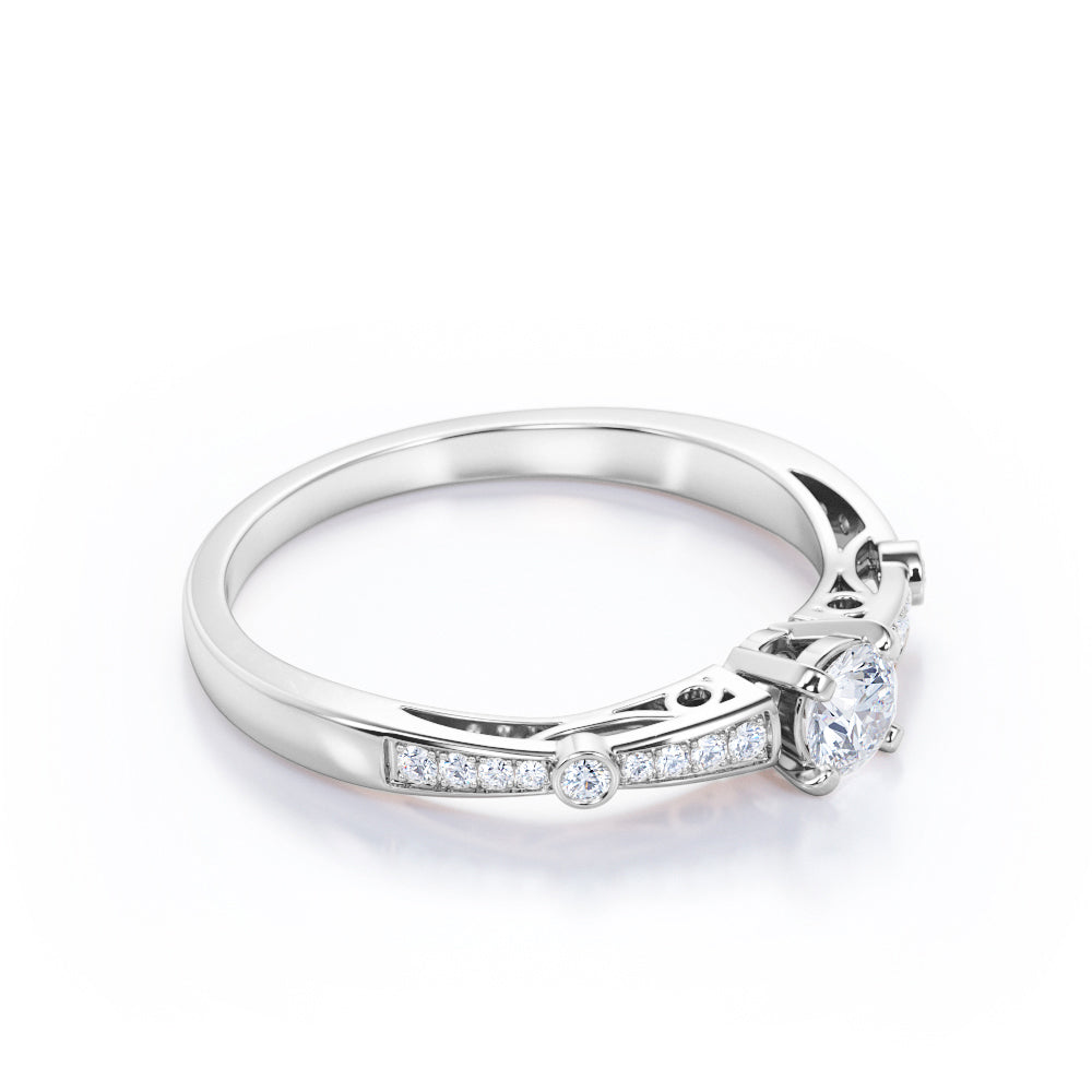 At your first glance, this Bowtie 0.7 carat Round Moissanite and Diamond Pinched Shank Anniversary Ring in White Gold might look very simple but it hides some intricate design beneath this classic design ring. A 0.5 carat round Moissanite is placed among the pinched shank band that looks like a bowtie with its round bezel Moissanite and the tapered band that holds beaded round Moissanite within. Sides od the band are engraved into a unique pattern. Round and curved lined are created on the band and adds the complexity to the promise ring. All of our Moissanite rings can be made in 18k gold over silver, 10k gold, 14k gold with the color of white gold, rose gold, yellow gold and black gold.