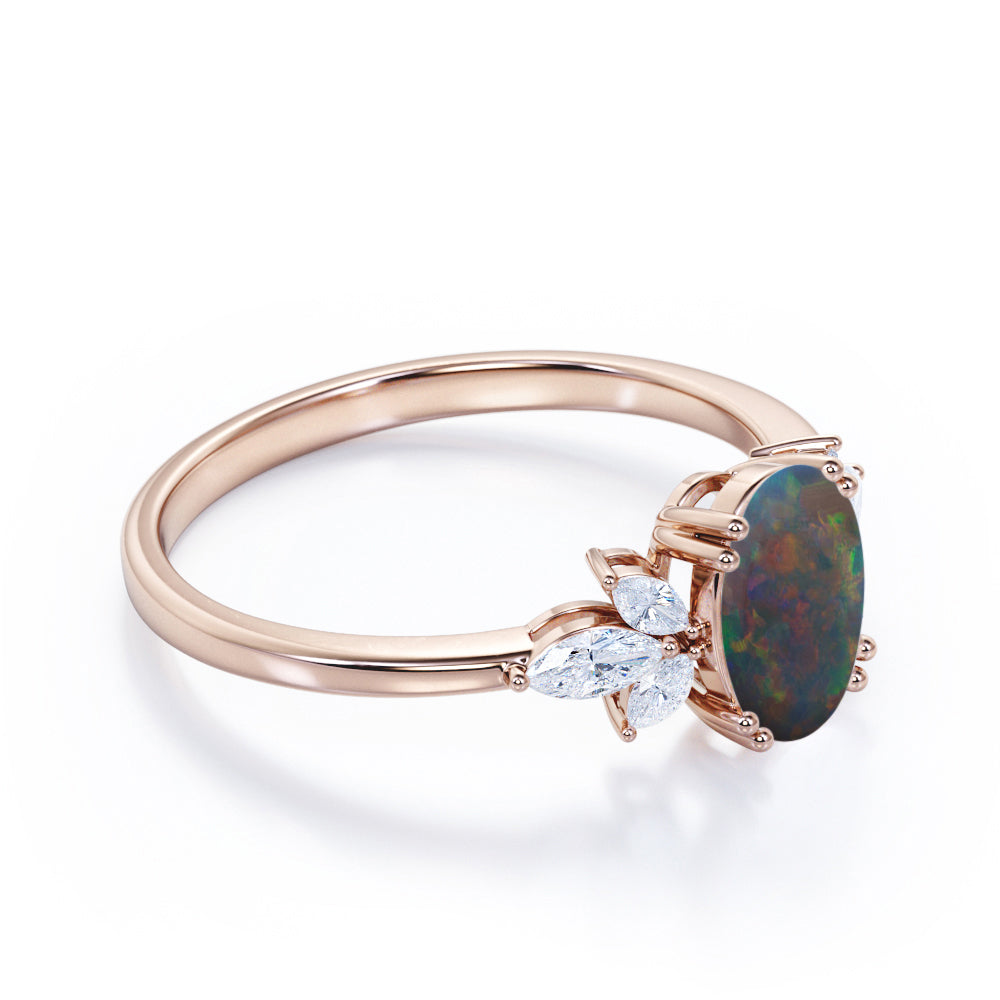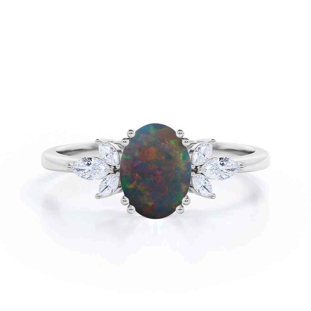 Butterfly style 1.25 Carat Oval Cut Natural Black Fiery Opal And Diamond Nature Inspired Engagement Ring In White Gold. A brilliant gift to celebrate your growing love, this ring will take her breath away. Let your love and commitment shine with this dazzling ring. One carat oval shaped natural opal is framed by 0.25 carat beautiful marquise cut shimmering diamonds in leaf-shaped settings on either side of the center stone. This floral design ring is gorgeously luxurious and unique with a large center stone and the delicate plain white gold band. This eight prongs ring is a splendid choice you are sure to adore. With multiple options for personalization, this butterfly style is a perfect gift for any lady or the perfect reason to spoil yourself. Since all our rings are handmade by our experienced artisans with love and care, this butterfly style 1.25 carat round cut white fiery opal and diamond nature inspired ring in white gold can also be customized to 18k Gold plating over silver, 10k Gold or 14k Gold as you desire.