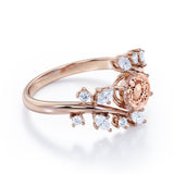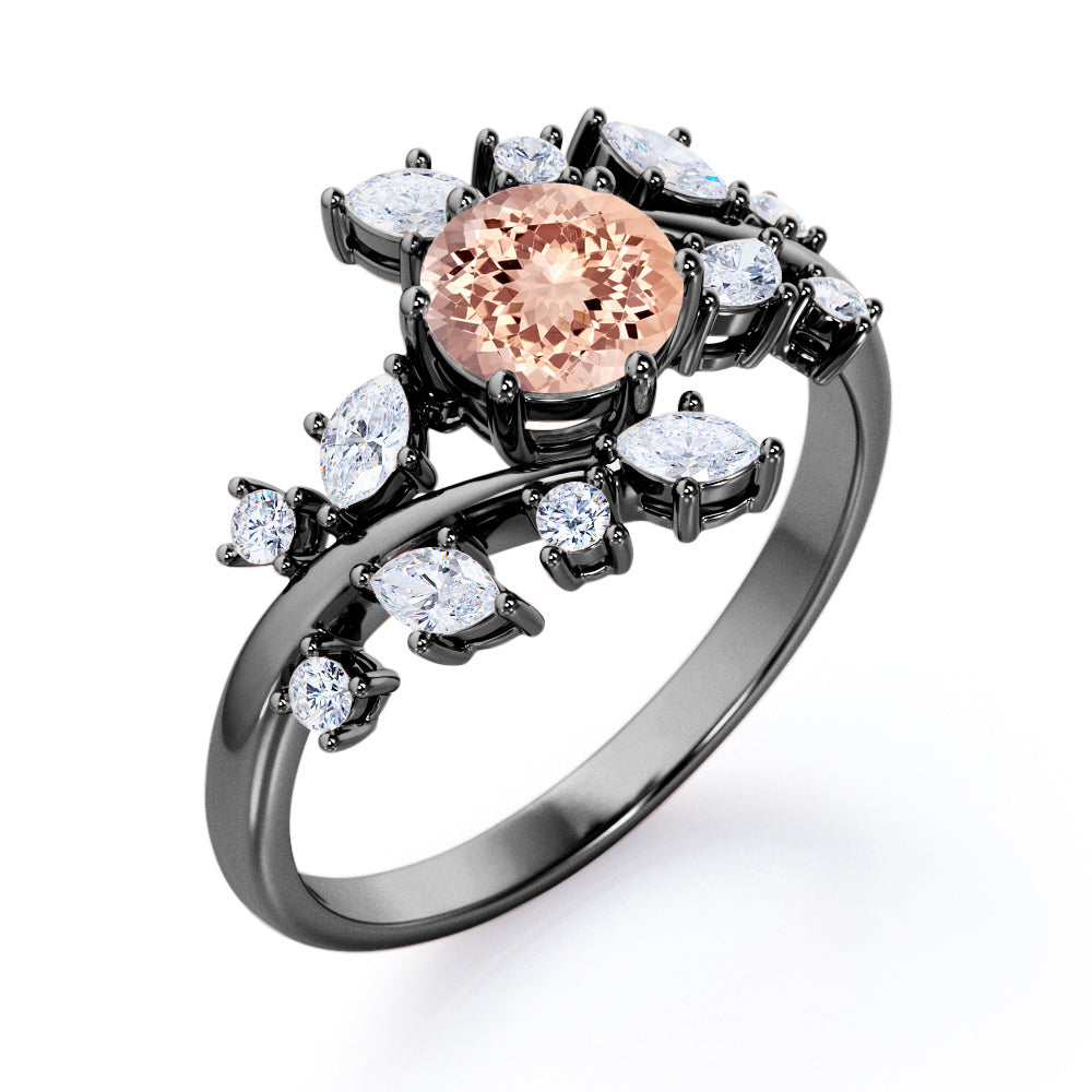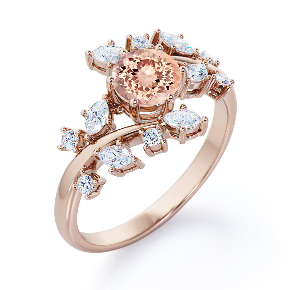 A bypass ring usually comes with classic paved bands or plain one but our shop offers a curved shank that is decorated with dainty round and marquise Moissanite like tree branches that wave along the wind. If your beloved one is a fan of nature-inspired jewelry, this could be a nice option that you can celebrate their special events with this unique Morganite ring. It can be customized to your choice of 18k gold over silver, 10k gold or 14k gold with 3 color options; white gold, rose gold, and black gold.