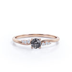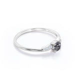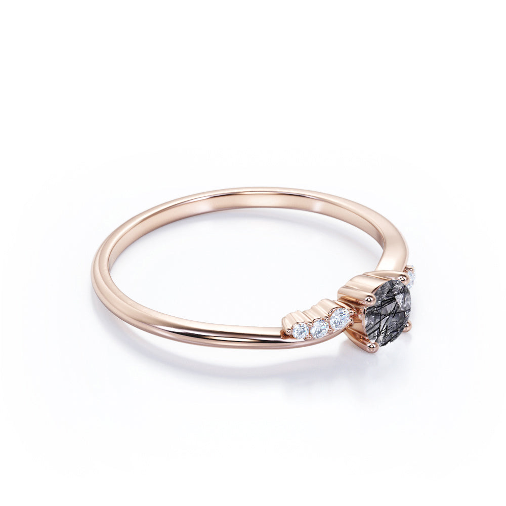 This Bypass Prong Setting 0.65 Carat Round Cut Natural Dendritic Black Rutilated Quartz and Diamond 7 Stone Promise Ring - Engagement Ring offers a very quirky and unique look on her finger. This lovely ring features .50 carat round cut black rutilated quartz and .15 carat real side diamond for gold ring and moissanite for silver ring, for a total 0.65 carat. It can be customized to either 10k, 14K and Gold over Silver and either Black Gold, Rose Gold, White Gold or Yellow Gold. Also, as your satisfaction is our most priority, we will do our best to have your handmade jewelry be carefully and beautifully crafted by our expert jewelers. The order also comes with a 30-day full refund policy. If you are looking for some unique rings, this natural black hair rutilated quartz ring is perfect for you. It is crowned as a highly beneficial crystals to aid wearers in manifesting what they are desire into their lives. Being considered an illuminator for the soul, promoting spiritual growth, this rutilated quartz ring will get rid of negative energy and disease. Due to its unique clear quartz with druzy black inclusions, this vintage rutilated quartz ring is sure to enchant its wearer. With its distinctive shiny black needles, this genuine druzy rutilated quartz ring is sure to be eye-catching and bring all eyes on you. This ring is available at a very affordable price and available in both silver and gold ring. While many gemstones are most valuable when they contain few or no inclusions, rutilated quartz is actually prized because of its unique inclusions. Being an uplifted stone, this rutilated quartz ring infuses joy into your life and surrounding environment. Embellish her finger with this ring which is perfect for any occasion and everyday wear. With its mesmerizing patters of colors and inclusions, this rutilated quartz ring will enchant your special someone with gracefulness.