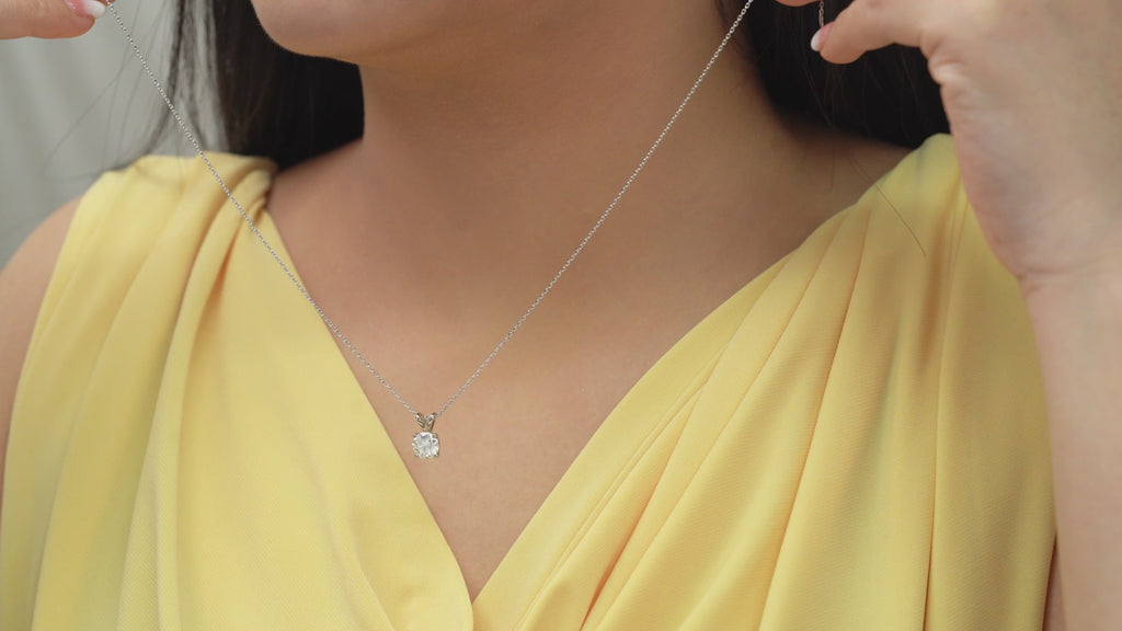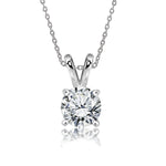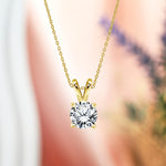 Make your special day most memorable with this 2 Carat Round Cut Moissanite Brilliant Pendant Necklace - 18K Yellow Gold Plating Over Silver. Skillfully hand-cut into a nice round cut by our skilled jewelers, this flawless moissanite solitaire necklace comprises 2 carat moissanite on solid yellow plating over silver. Special and non-traditional, this moissanite necklace is well-suited for those who are not quite into normal lifestyle. With naked eyes moissanites look, shine and feel exactly like diamonds. With its splendor, this pendant necklace with moissanite will absolutely enhance every style of its wearer. Hanging in a silver cable chain that is secured by a spring ring clasp, this moissanite pendant necklace is beautiful and accessible since it is available at a reasonable price. Moissanites are the most popular alternative gemstone for diamonds while being at lower and more affordable price. Considered as a symbol of timeless love and affection for your lover, this moissanite necklace , the birthstone pendant necklace for April, symbolically representing strength and an unbreakable love, will be the greatest choice you will ever make. Additionally, this moissanite pendant necklace can be customized to your own choice of metal colors: 18K rose gold plating over silver, 18K white gold plating over silver, or 18K yellow gold plating over silver. In regards to its hardness, moissanite is almost as hard as diamond which means that it is notably durable. Let’s impress her with this pendant necklace with a moissanite gemstone and she will be eternally joyful.