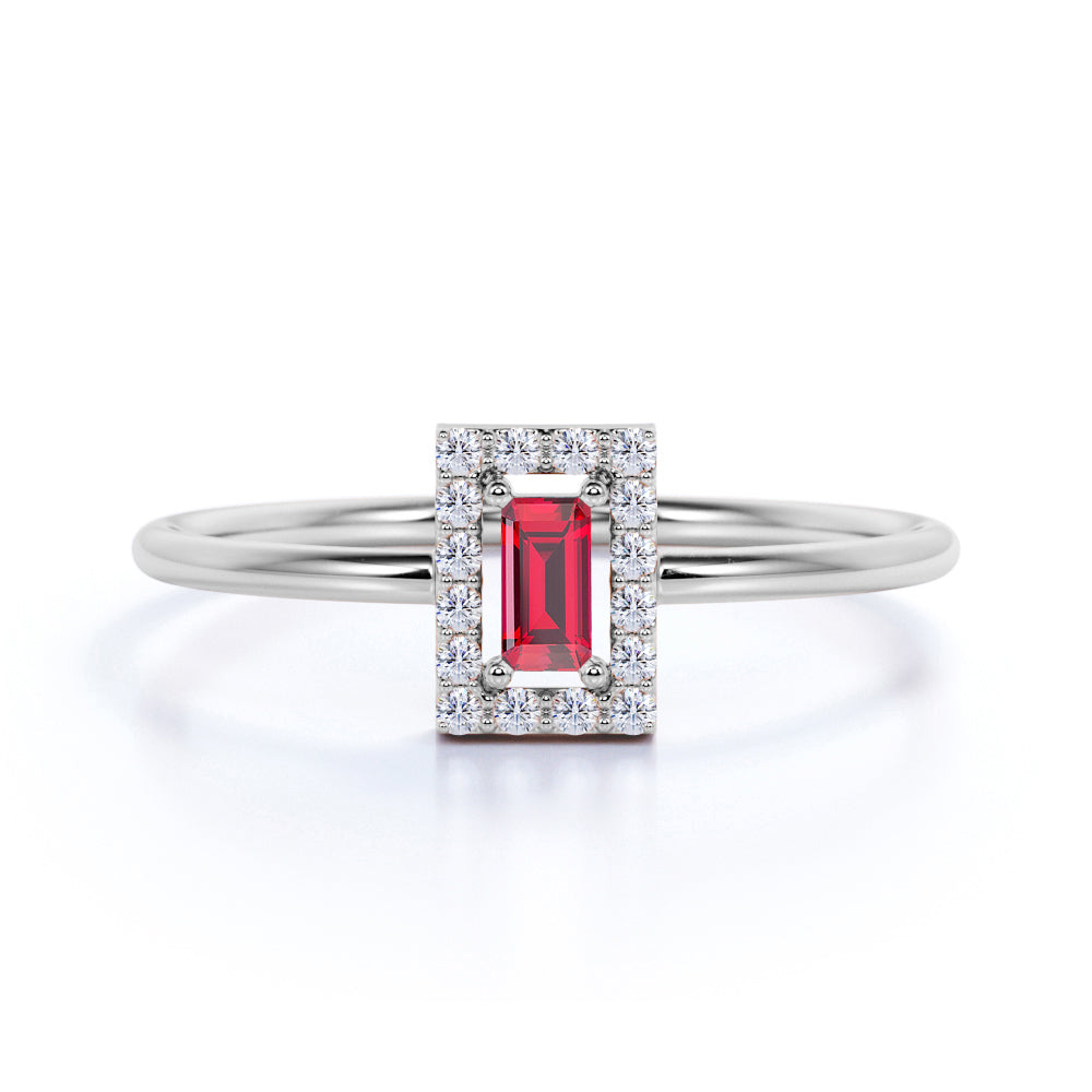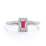 This small ruby ring is the best for you, not just by the look but the price and quality as well. Dainty, petite and minimalist approach. Little by little, this little ruby ring will soon be yours and you can finally ask her to marry you. This minimal ruby ring features an approximately .15 carat emerald cut authentic ruby, surrounded by .16 carat genuine diamond accent, for a total weight of 0.31 carats.