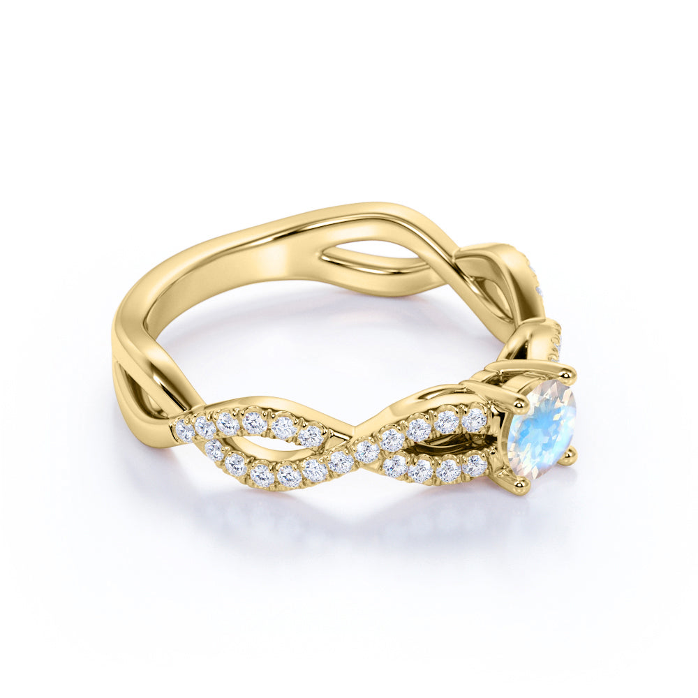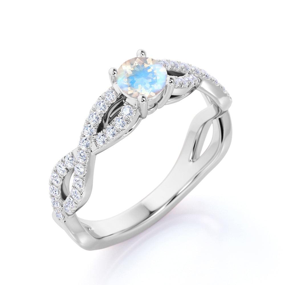 Enchanting on its own way, this faceted blue moonstone and diamond twisted engagement ring displays a variety of colors from different angles when being passed by a light source. This infinity engagement ring features an approximately 6.5mm round cut natural blue moonstone, surrounded by .50 carat real diamonds for gold ring and moissanite for silver ring, for a total weight of 1.50 carats.
