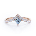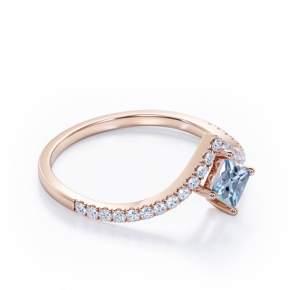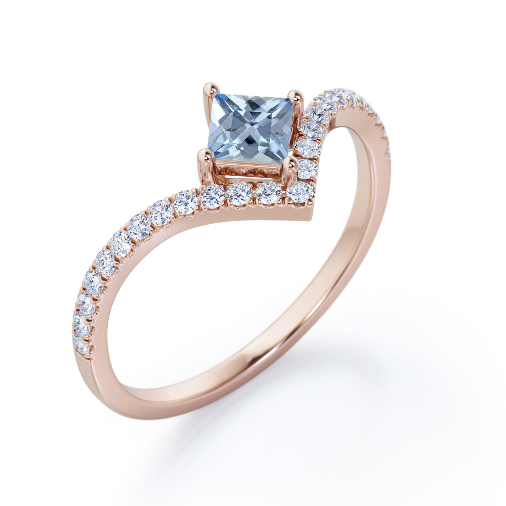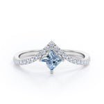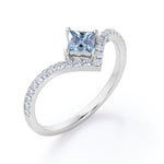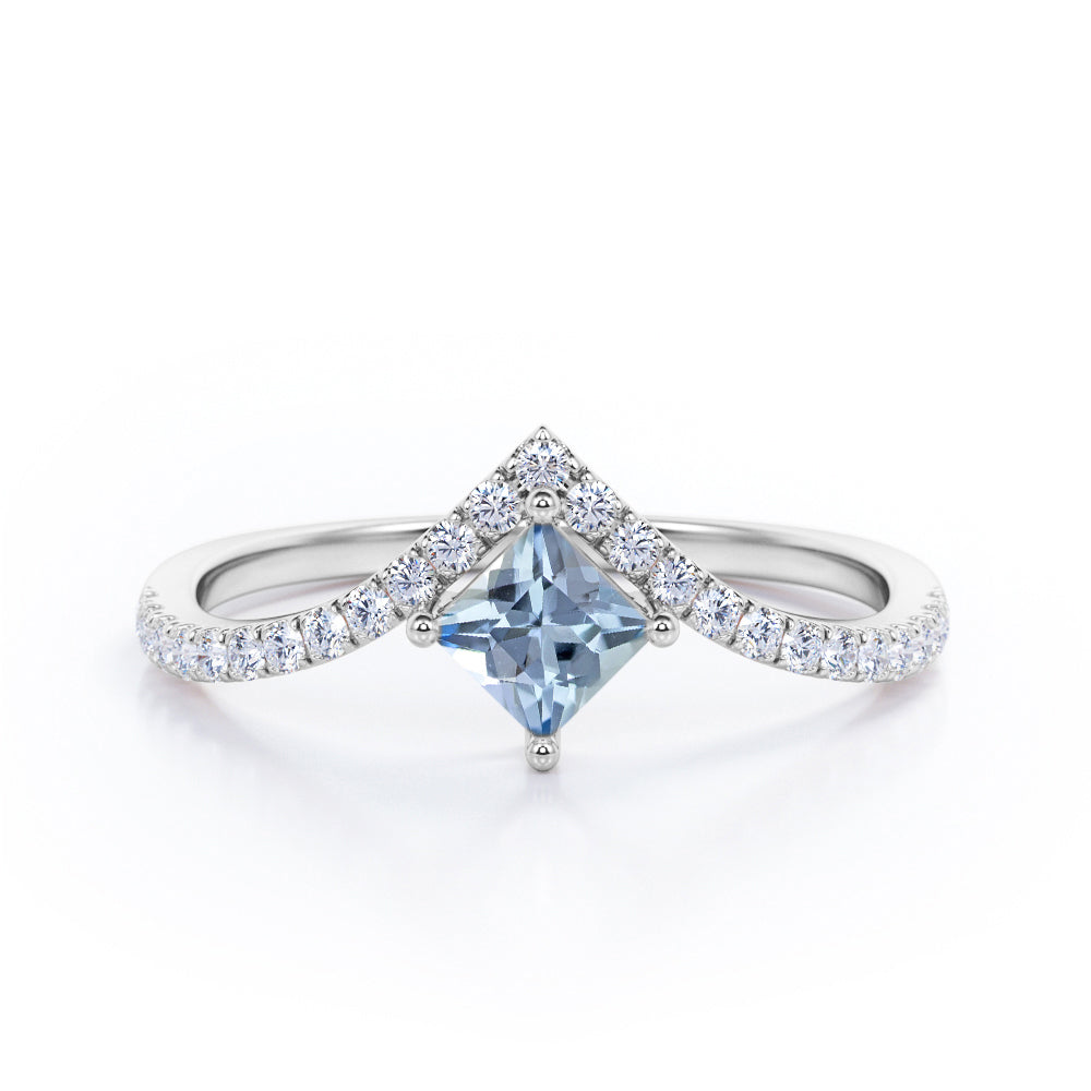 Chevron 1.25 Carat Princess Cut Aquamarine And Diamond Four Prong Pave Set Engagement Ring In White Gold. The distinct curvature of this chevron engagement ring incorporates an elegant movement that complements the hand so well. Featuring a sharp princess cut 1 carat aquamarine and 0.25 carat white shimmering bright diamonds, this statement piece feels more special. Small round cut pave set diamonds makes a tiara at the top of the center aquamarine stone which gives this engagement ring a royal vibes. With a simple half eternity white gold band, all the attention is on the four prong set center stone. As your satisfaction is our top most priority, we will do our best to have your handmade engagement ring be carefully crafted by our expert artisans. You can also customize this chevron 1.25 carat princess cut four prong pave set engagement ring in white gold into 18k Gold plating over silver, 10k Gold or 14k Gold as per you preference. Please note that if the ring is made over silver, the side stone will be moissanite and if it is made on gold, diamond will be employed as the side stone.