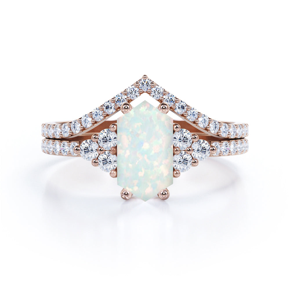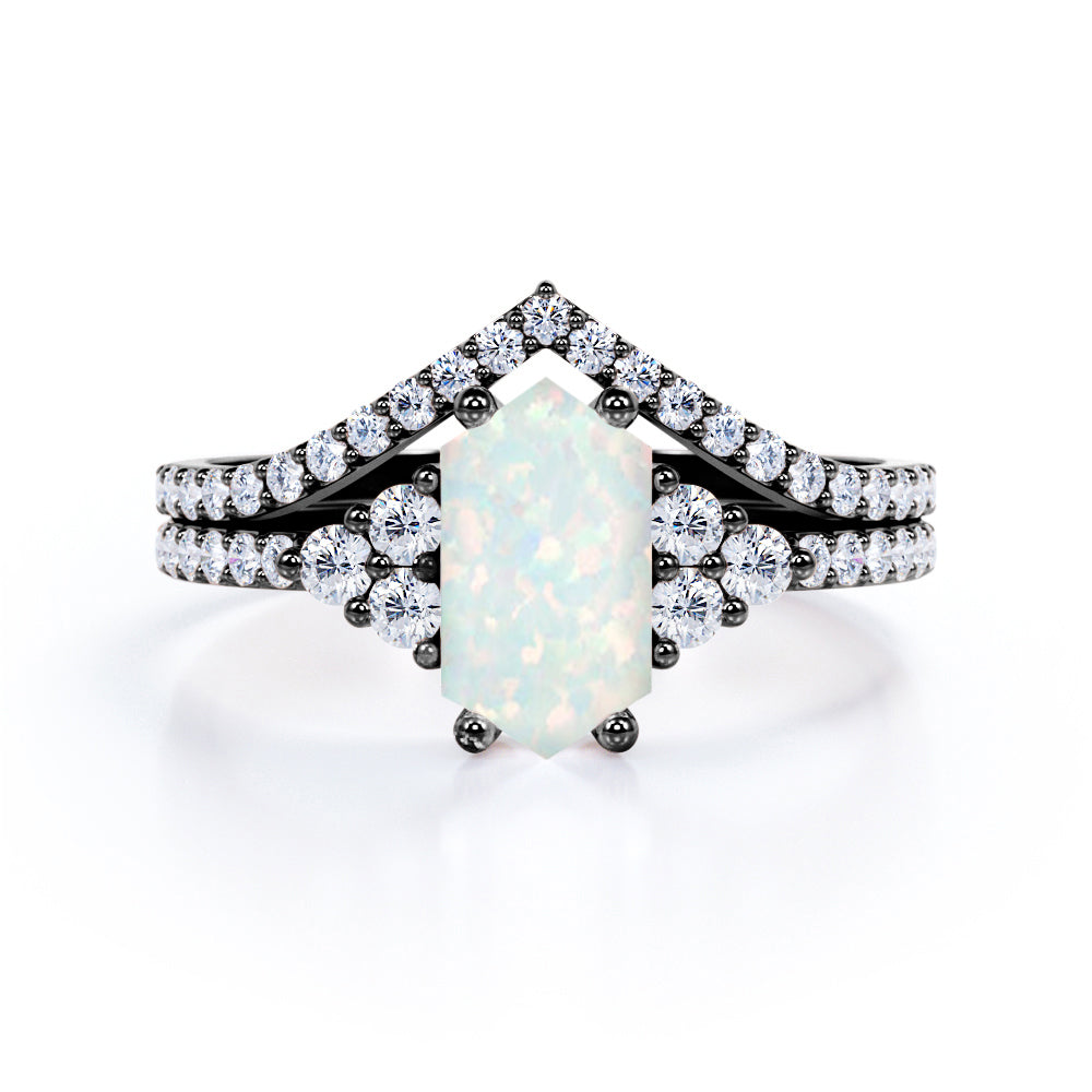 Chevron Pave Set 1.55 Carat Hexagon Cut White Fiery Opal And Diamond V Shaped Wedding Ring Set In Black Gold. You're not missing out on any sparkle with this seven stone wedding ring set. Featuring a row of brilliant round diamonds on a white gold band, we love the stunning contrast and amazing brilliance that this piece exudes. This magnificent wedding ring set comprises of one engagement ring and a matching wedding band. The engagement ring features 1 carat solitaire hexagon shaped natural opal as the center stone complemented by three set of round shaped diamonds on either sides inclusive of the matching V shaped wedding band. The pave set diamonds of 0.60 carat in this wedding set illuminates great brilliance and undeniable sparkle which will surely make you stand out in the crowd. The four prongs holds the center stone perfectly letting it be the show of the overall set. Handmade by our old artisans, this Chevron pave set 1.55 carat hexagon cut white fiery opal and diamond V shaped wedding ring set in black gold can also be customized to 18k Gold plating over silver, 10k Gold or 14k Gold as per you preference.