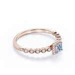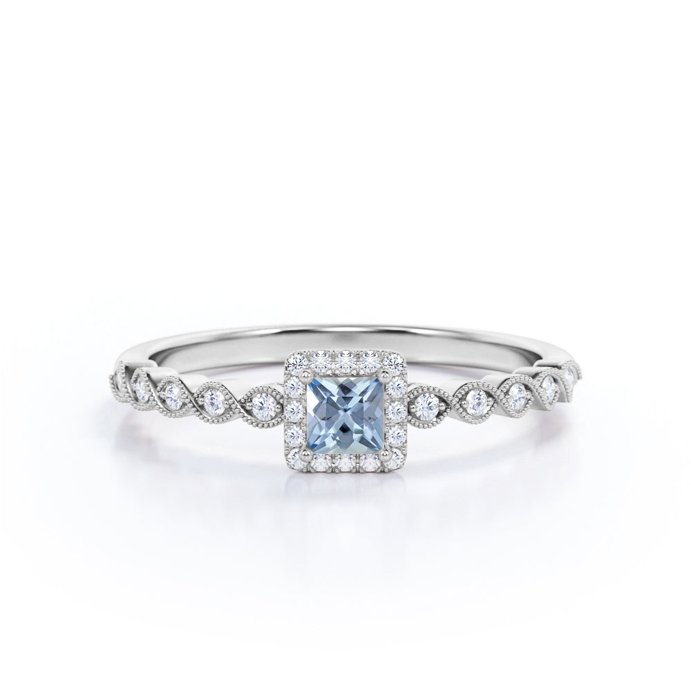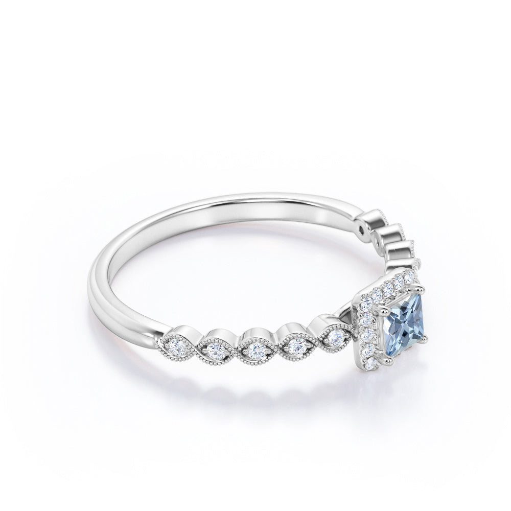 Classic 0.85 Carat Princess Cut Aquamarine And Diamond Vintage Engagement Ring In White Gold. Fascinating in its own way, this classic promise ring is truly one of a kind. A dazzlingly blue aquamarine center stone highlights this exquisite promise ring surrounded by paved dazzling diamond side stones in a halo setting while the ring band is detailed with delicate milgrain beadings in a swirling motion forming an eye shape passionately handcrafted by our talented and experienced jewelers. Handmade to perfection, this uniquely styled engagement ring is made with 0.7 carat very fine princess-cut aquamarine center stone, surrounded by 0.15 carat dazzling round diamond side stones for the gold rings and moissanite for the silver rings that weigh a total of 0.85 carat. Exquisite in white gold, this vintage promise ring is also available in rose gold, yellow gold, and black gold. Also, it can be made between 18k gold over silver, 10k gold, and 14k gold depending on your preferred customization. Please kindly note for the silver ring option that silver is a very sensitive metal, any chemicals like hand creams, lotion, or sanitizers. etc., can affect the plating.