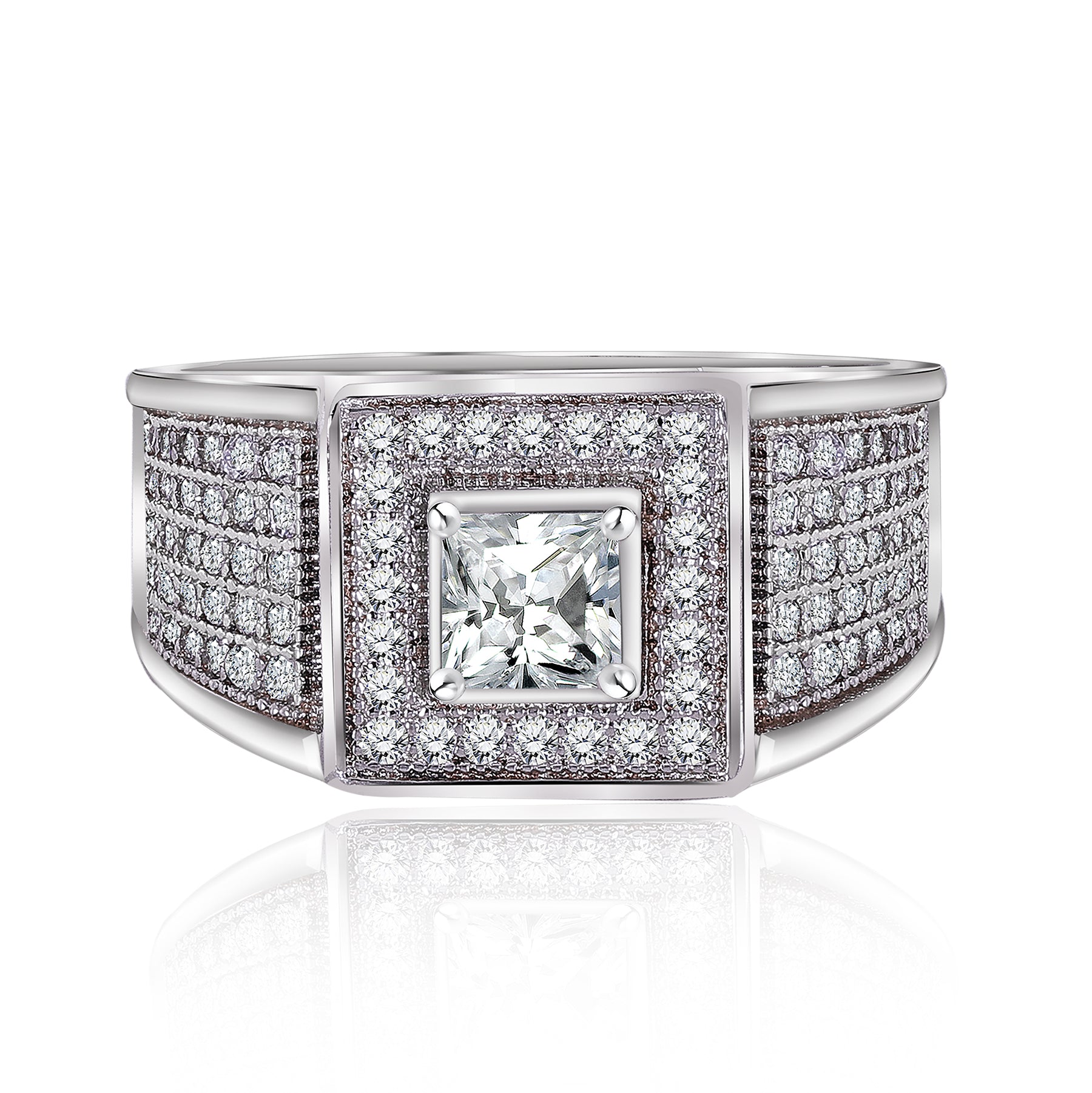 Make this father's day special with our Classic 1.2 Carat Princess Cut Halo Clustered Bordered Moissanite Men's Wedding Ring Band in 18K White Gold over Silver. Crafted with love and care, this is the best father's day gift for your beloved father. The stylish band of this men's ring is specially designed by our expert jewelers to be as thick and sturdy for it to be able to last for a lifetime. The band is beautifully decorated by clustered moissanite and a halo surrounding the princess moissanite in the center. Consisting of sterling silver, this dad day's gift is sure to be sturdy and suitable for everyday wear. This father's day craft is the perfect gift for your father with its affordable uniqueness and special design. Our silver ring for men is the best gift for daughters, sons, and children to give to their beloved father. Let your father know how much he means to you with our Classic 1.2 Carat Princess Cut Clustered Bordered Moissanite Men's Wedding Ring Band in 18K White Gold over Silver.