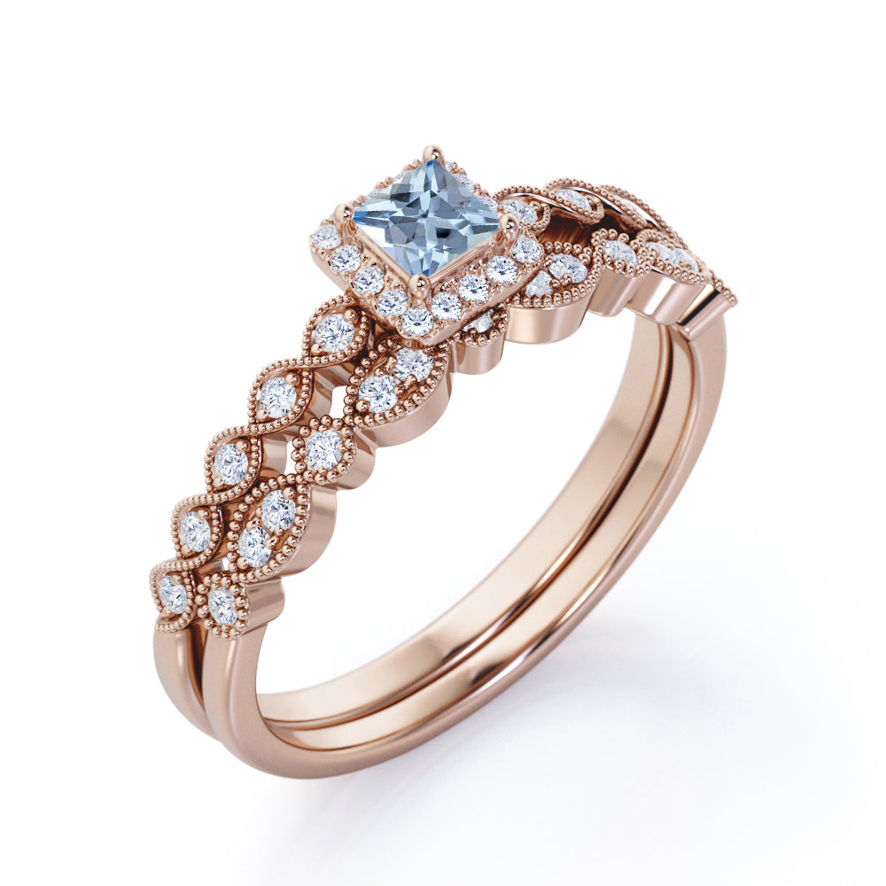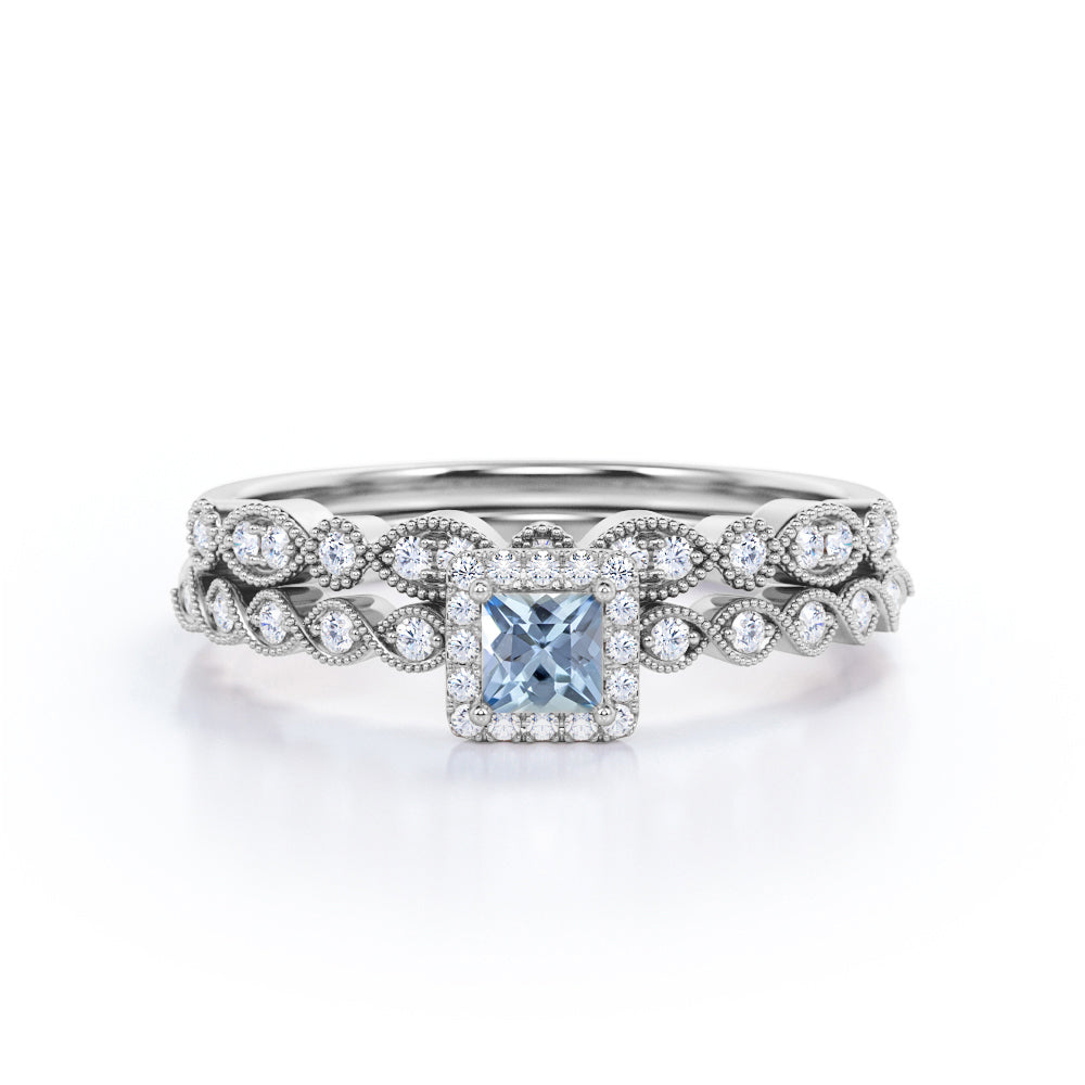 Classic 1.20 Carat Princess Cut Aquamarine And Diamond Vintage Wedding Ring Set In White Gold. Fascinating in its own way, this classic bridal set is truly one of a kind. A dazzlingly blue aquamarine center stone highlights this exquisite promise ring surrounded by paved dazzling diamond side stones in a halo setting while the ring band is detailed with delicate milgrain beadings in a swirling motion forming an eye shape while the matching wedding band features an art deco style with milgrain beadings passionately handcrafted by our talented and experienced jewelers. Handmade to perfection, this uniquely styled wedding ring set is made with 1 carat very fine princess-cut aquamarine center stone, surrounded by 0.20 carat dazzling round diamond side stones for the gold rings and moissanite for the silver rings that weigh a total of 1.2 carat. Exquisite in white gold, this vintage bridal set is also available in rose gold, yellow gold, and black gold. Also, it can be made between 18k gold over silver, 10k gold, and 14k gold depending on your preferred customization. Please kindly note for the silver ring option that silver is a very sensitive metal, any chemicals like hand creams, lotion, or sanitizers. etc., can affect the plating.