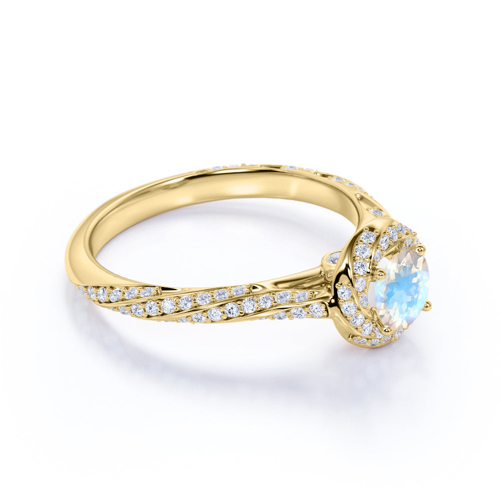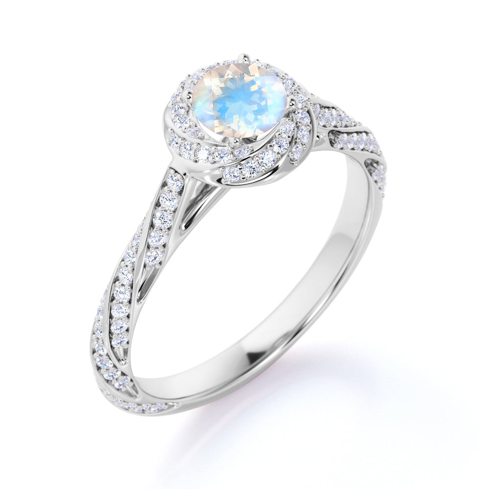 Enchanting on its own way, this blue moonstone and diamond halo engagement ring displays a variety of colors from different angles when being passed by a light source. This classic engagement ring features an approximately 1 carat round cut natural blue moonstone in the center of the engagement ring, surrounded by .25 carat real diamonds for gold ring and moissanite for silver ring, for a total weight of 1.25 carats.