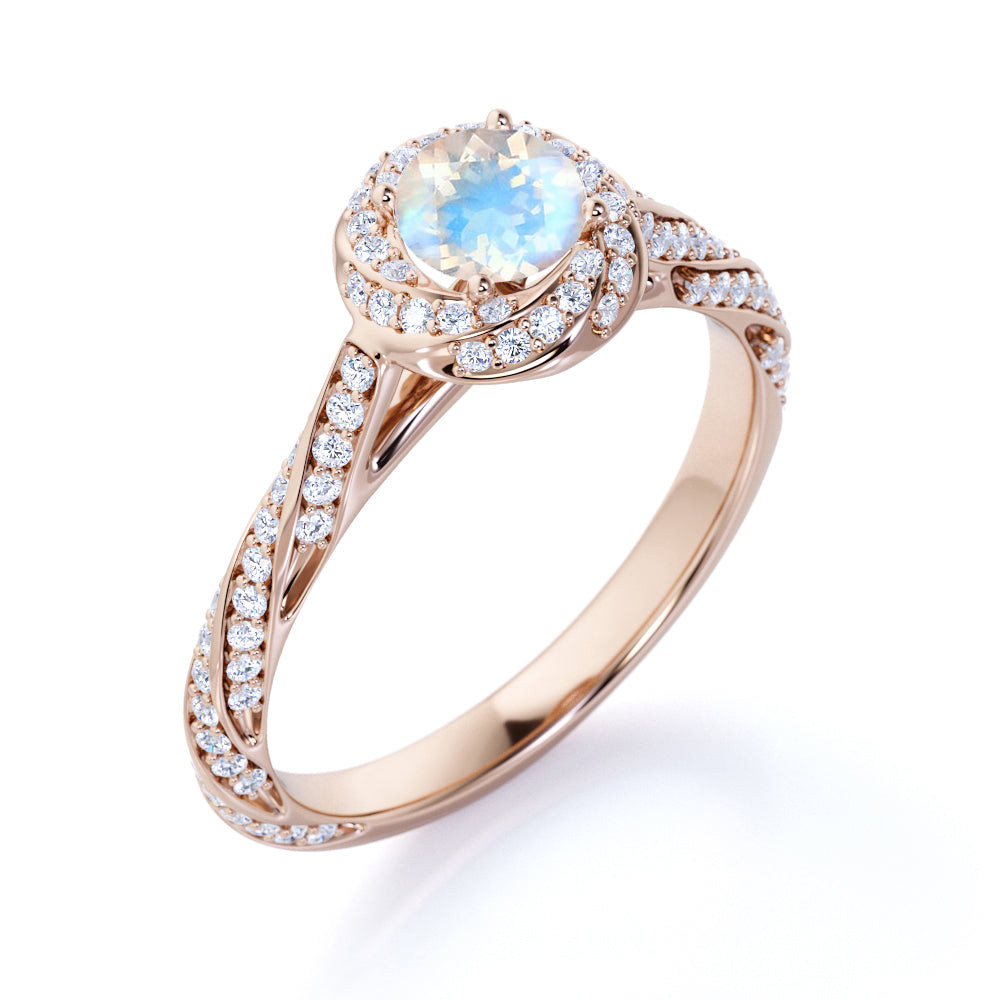1.25 Carat Round Moonstone and Diamond Engagement Ring in Rose Gold - Blue Moonstone Ring