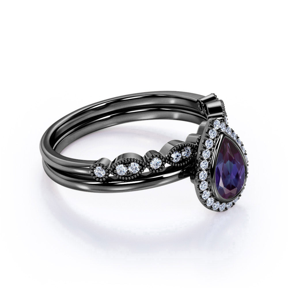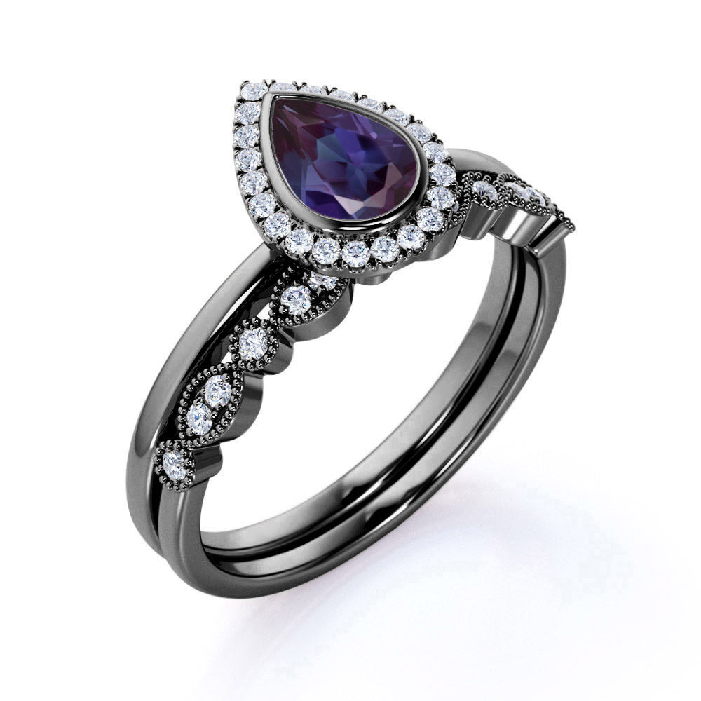 Be on cloud nine with this Classic 1.50 Carat Pear Shape Lab Created Alexandrite and Diamond Halo Art Deco Bridal Set Rings. This antique rings feature 1 carat pear cut lab grown Alexandrite and .25 carat real genuine side diamond for gold ring and moissanite for silver ring. This intricate wedding ring sets can be customized to either 10k, 14K and Gold over Silver and either Black Gold, Rose Gold, White Gold or Yellow Gold. Also, as your satisfaction is our most priority, we will do our best to have your handmade jewelry be carefully and beautifully crafted by our expert jewelers. The order also comes with a 30-day full refund policy. Enrich your charm and charisma with this vintage mystic lab grown Alexandrite ring for women that is excellent for everyday wear. With its unique ability to exhibit two colors, this ring will make you stand out from others. This flawless ring will be a perfect fit for you love story as it is believed that joy enters the lives of people through the stone. If you are searching for some alternate gemstone, this Friday's stone ring will be your right choice. This simulated Alexandrite ring gives a vivid grass green color in daylight and displays an intense raspberry red in candescent light. Embellish your love story with this beautiful man made Alexandrite ring and make it even more memorable. If you are in search of a perfect gift for any occasion, this delicate and stunning ring is the best answer for you. This ring is available at a very affordable price yet it offers a very expensive and gorgeous look on your finger. Impress your special someone with this beautiful and affordable lab created Alexandrite ring. With its mesmerizing color-change variety and unparalleled vibrancy, this flawless lab grown Alexandrite ring will enchant your special someone with gracefulness.
