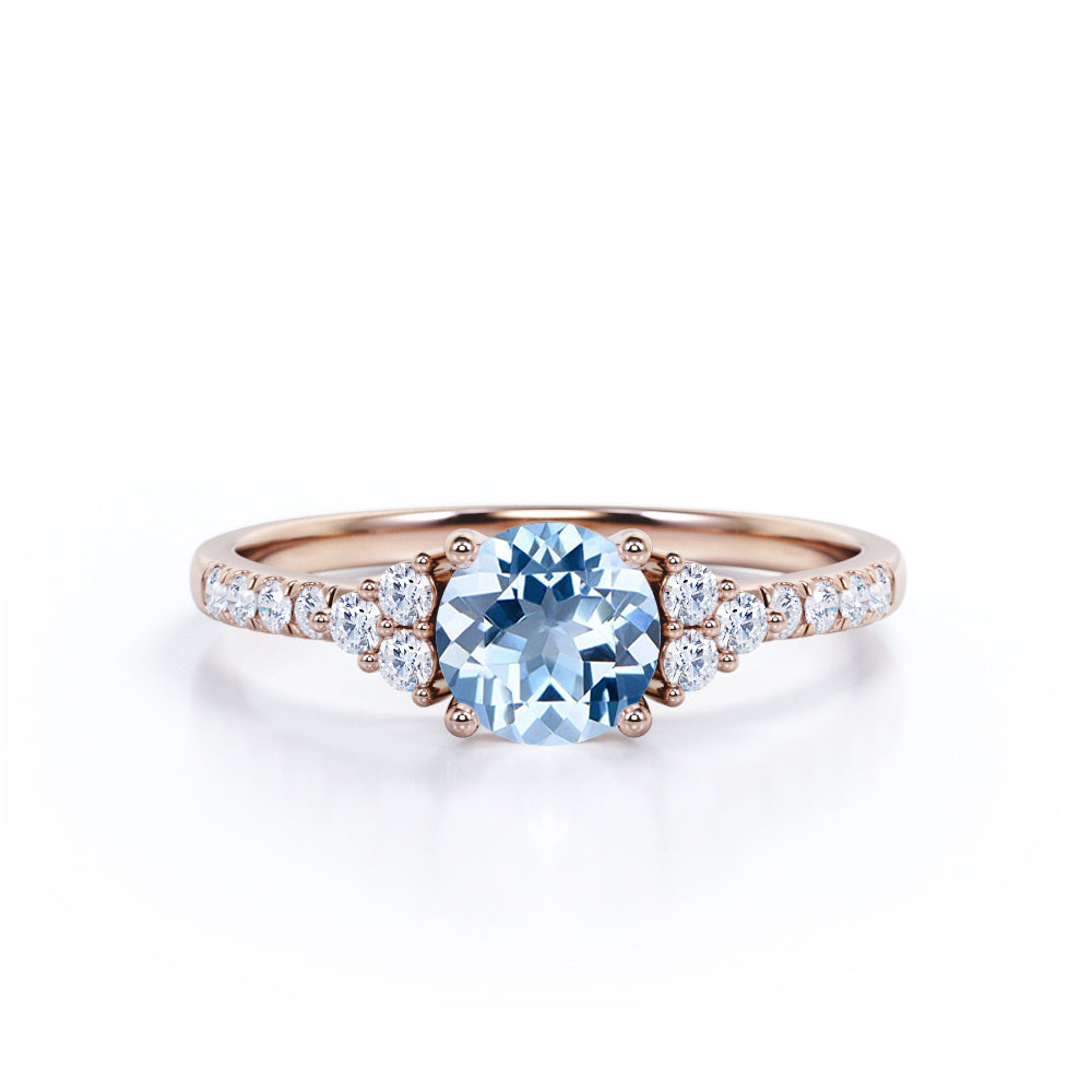 Classic 1.50 Carat Round Cut Aqua Sky Blue Aquamarine and Diamond 7 Stone Cluster Engagement Ring in Rose Gold for Women