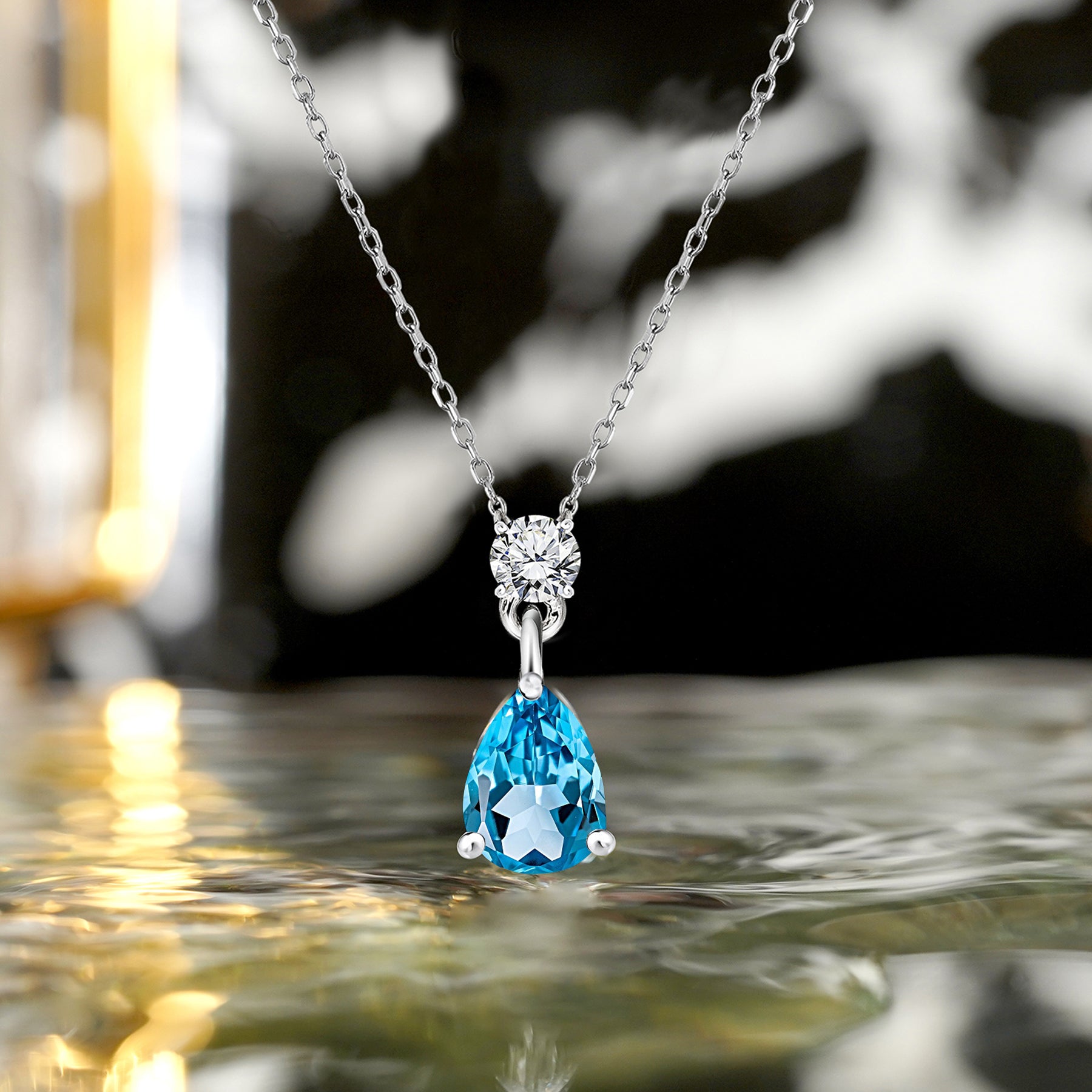 Start the greatest love story of your life with this Classic 2 Carat Round and Pear Cut Dangle - Blue Topaz - December Birthstone Pendant Necklace in 18k White Gold over Silver, Women. Professionally handcrafted into a fine pear cut by our skilled jewelers, this exceptional pendant necklace integrates 2 carat in silver. Let's fulfill your love story with this moissanite solitaire pendant necklace and, surely, she will not regret it.