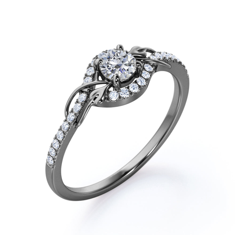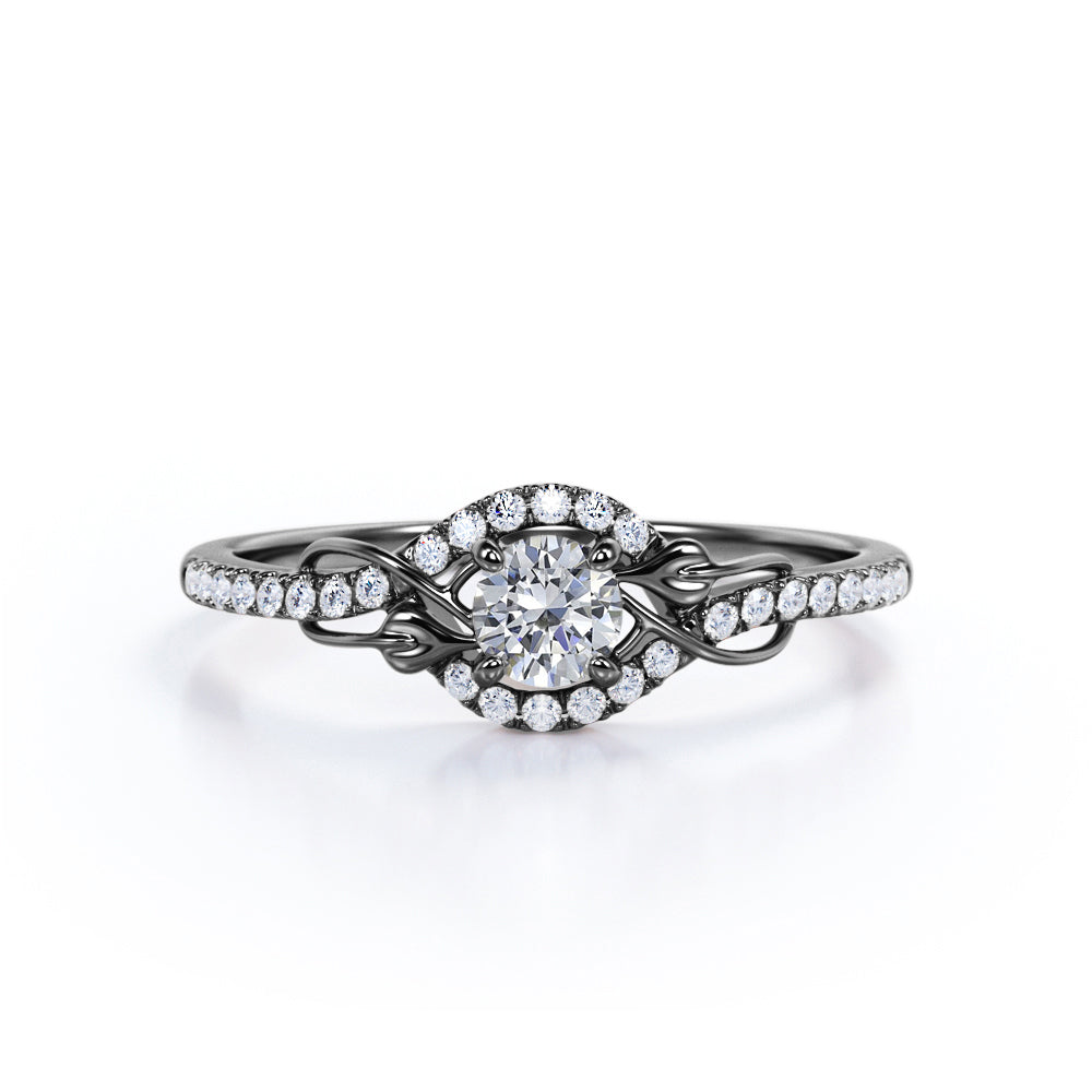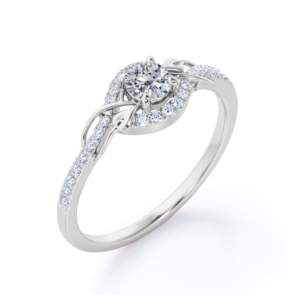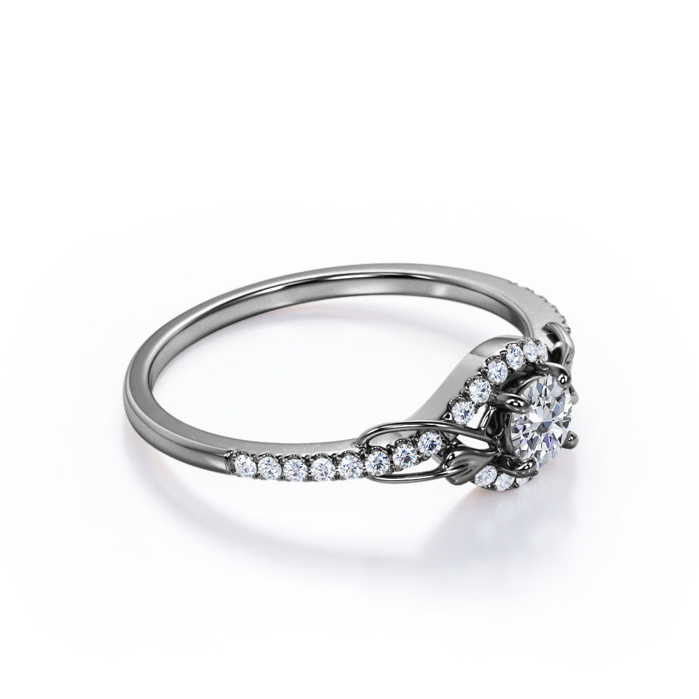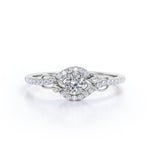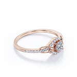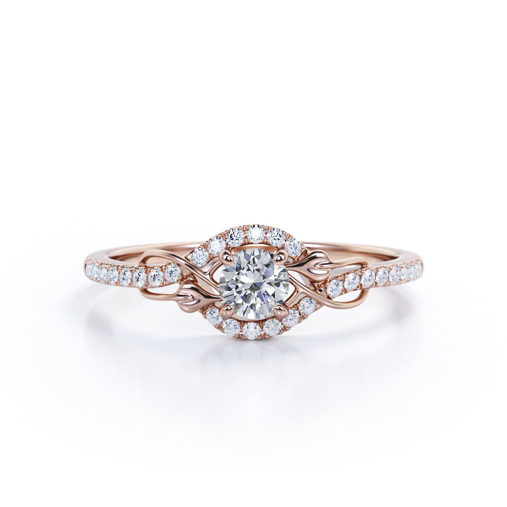 Swirl Halo 1 Carat Round Colorless Moissanite and Diamond French Pave Engagement Ring in Rose Gold