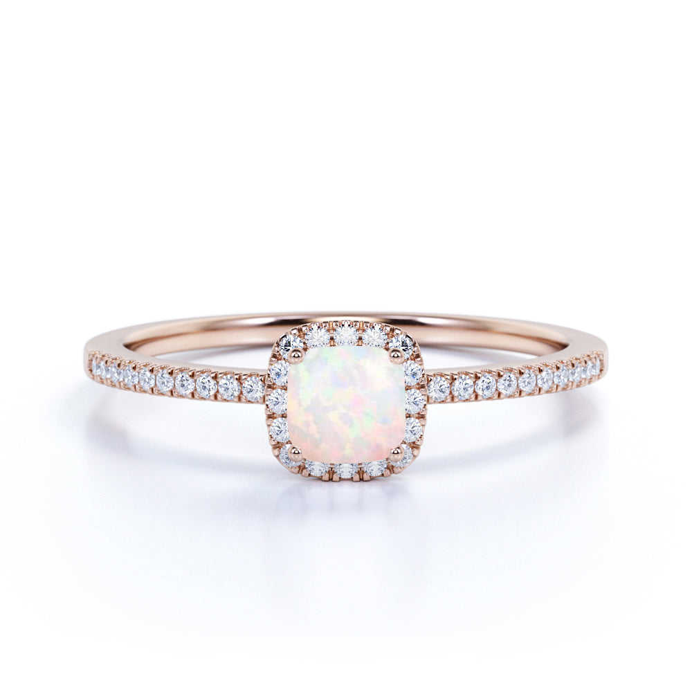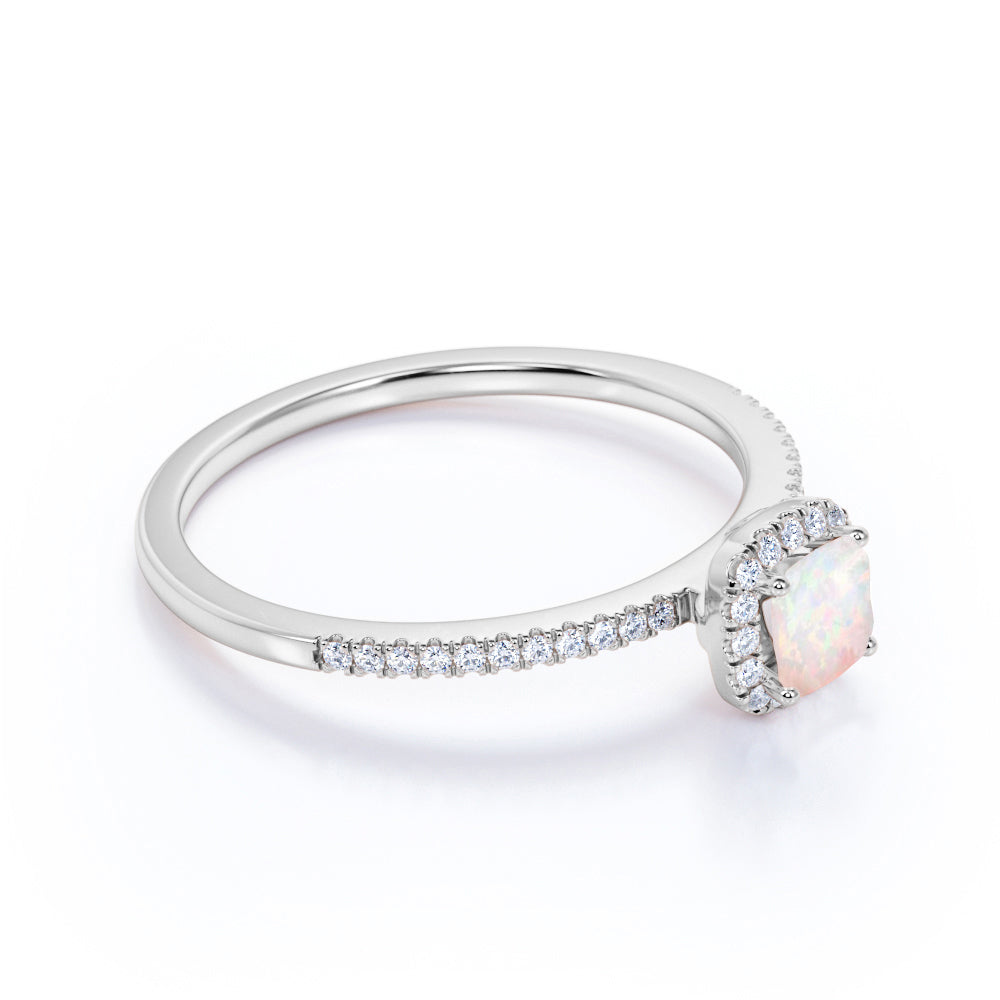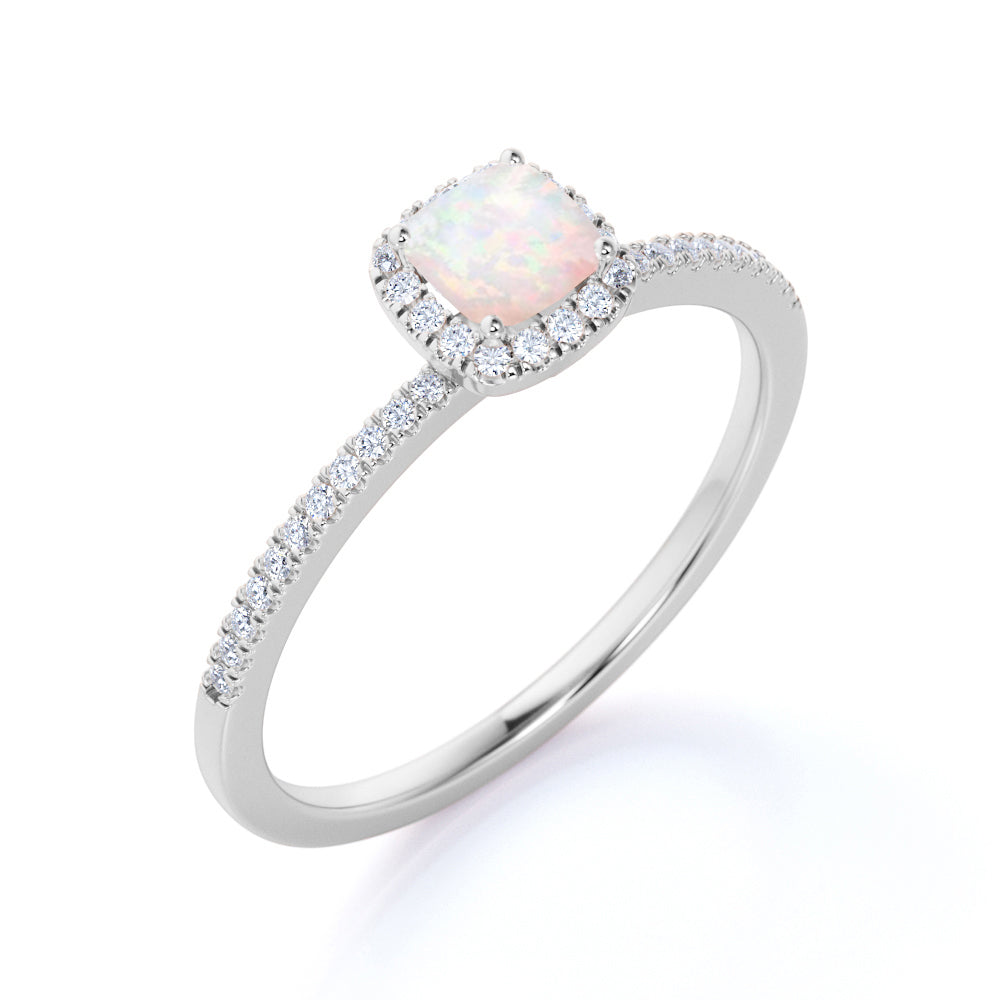 If you don't want a modern opal ring, this classic opal ring is the best for you. It reminisce your past and those times when you and her are still young lovers. We can also customize this opal engagement ring to become an infinity or eternity band which will reflects your love for each other and that love will surely last forever because of this amazing ring. This opal ring features an approximately .75 carat cushion cut natural opal, surrounded by .25 carat genuine side diamonds for gold ring and moissaniet for silver ring, for a total weight of 1 carats.
