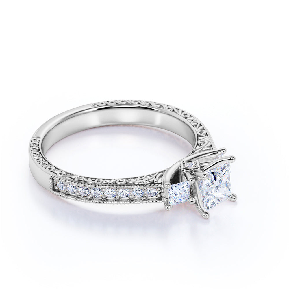 Classic 1 Carat Princess Cut Moissanite - Vintage - Beaded - Three Stone - Victorian Engagement Ring in 10K White Gold