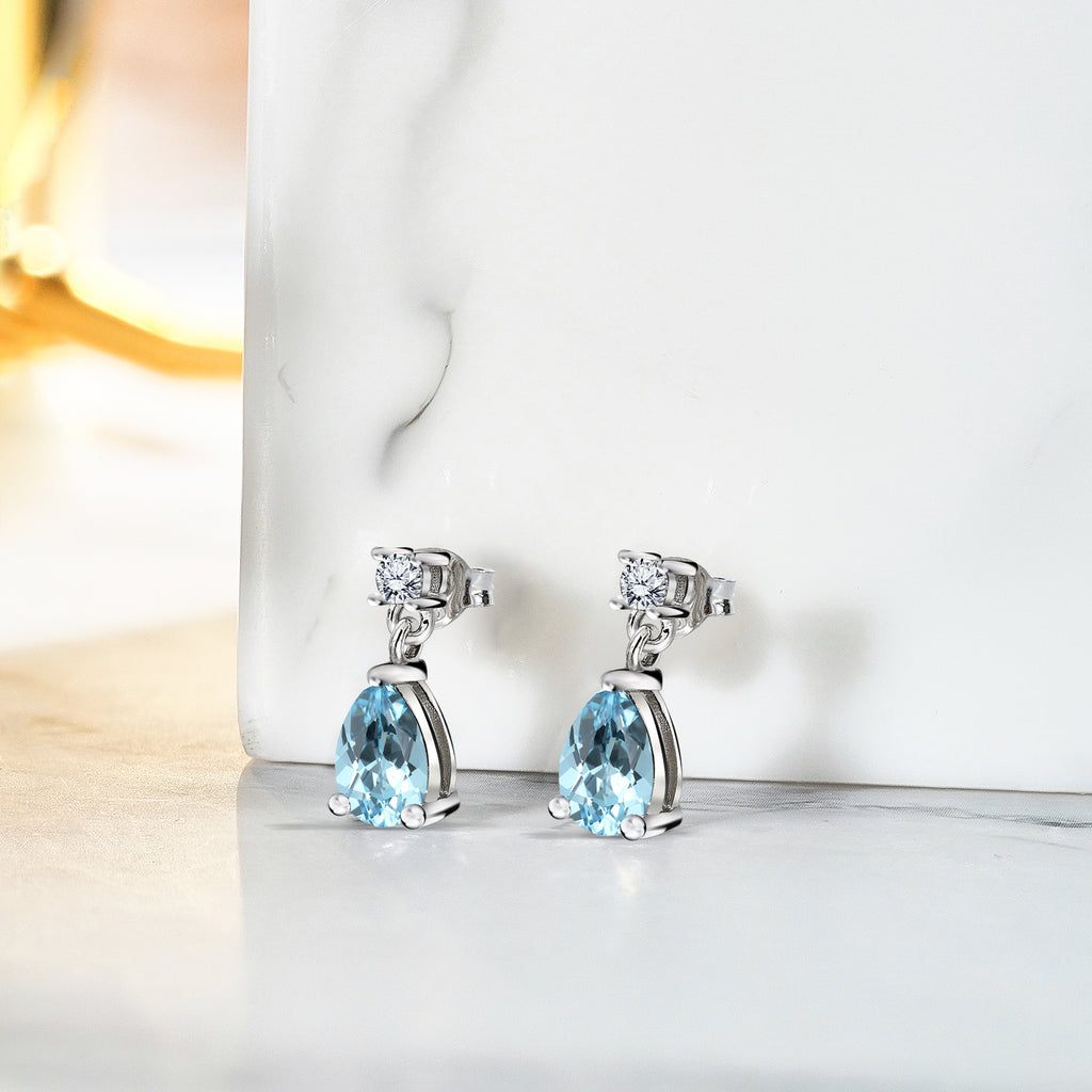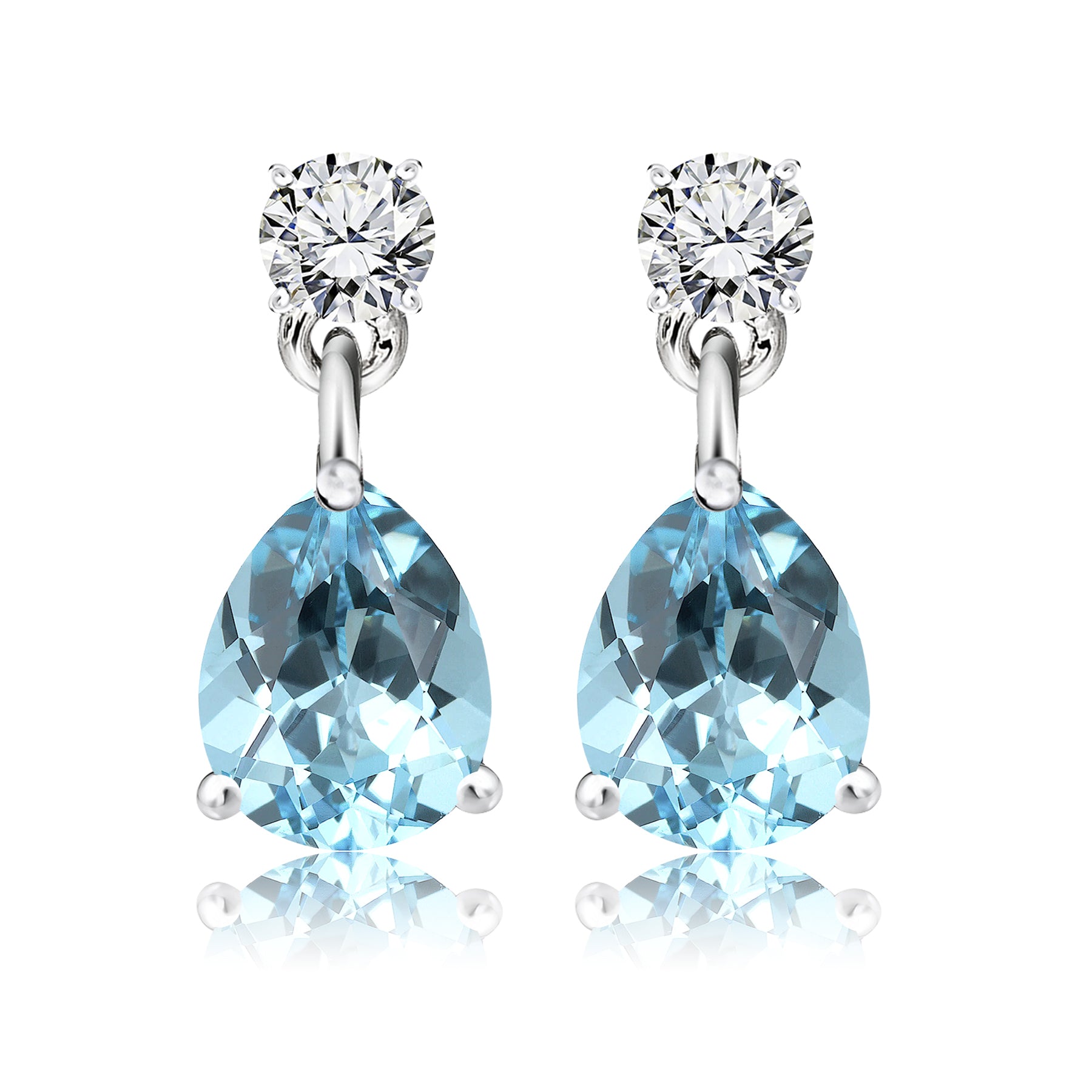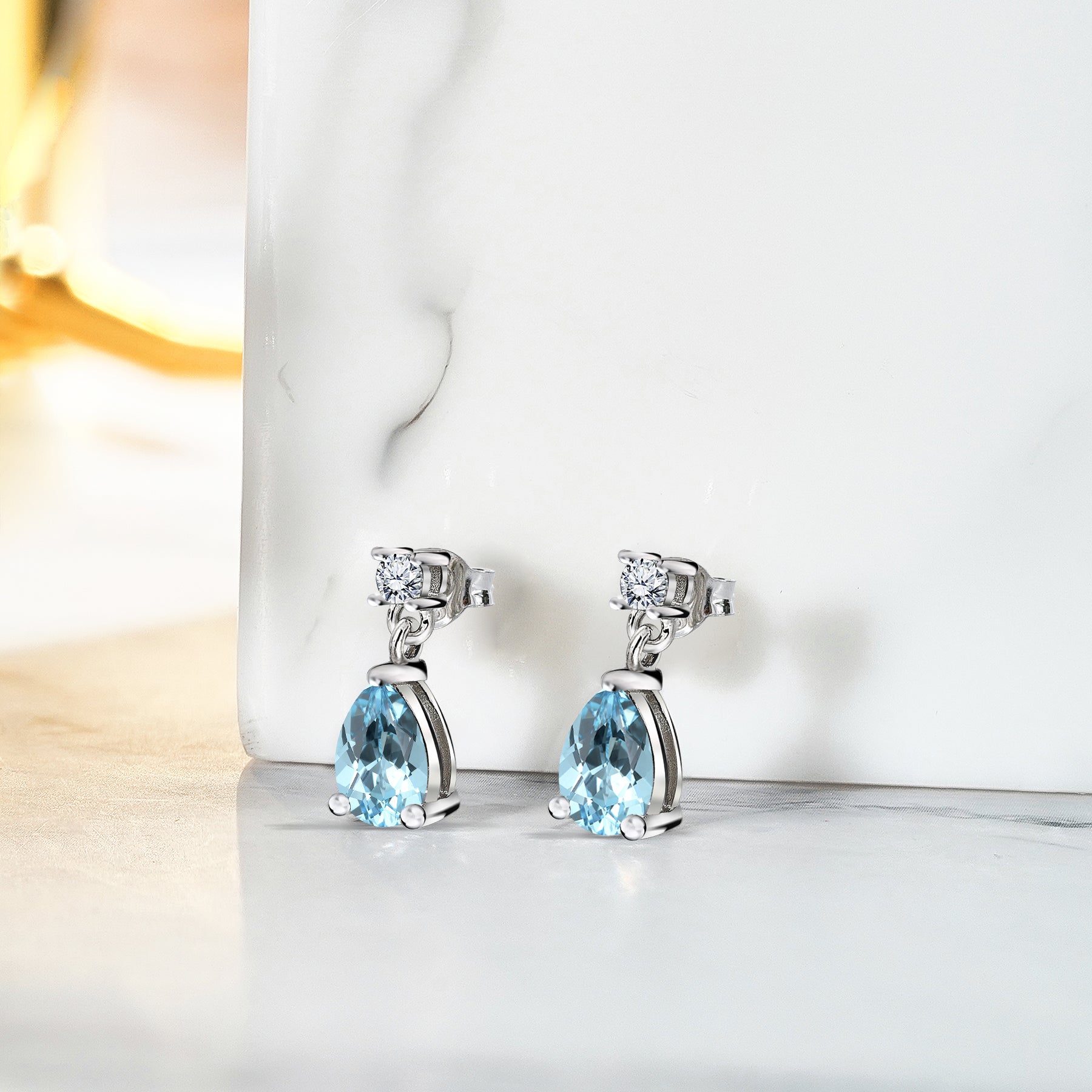 Classic 2.5 Carat Round and Pear Cut Dangle - Aquamarine - March Birthstone Earrings in 18k White Gold over Silver, Women