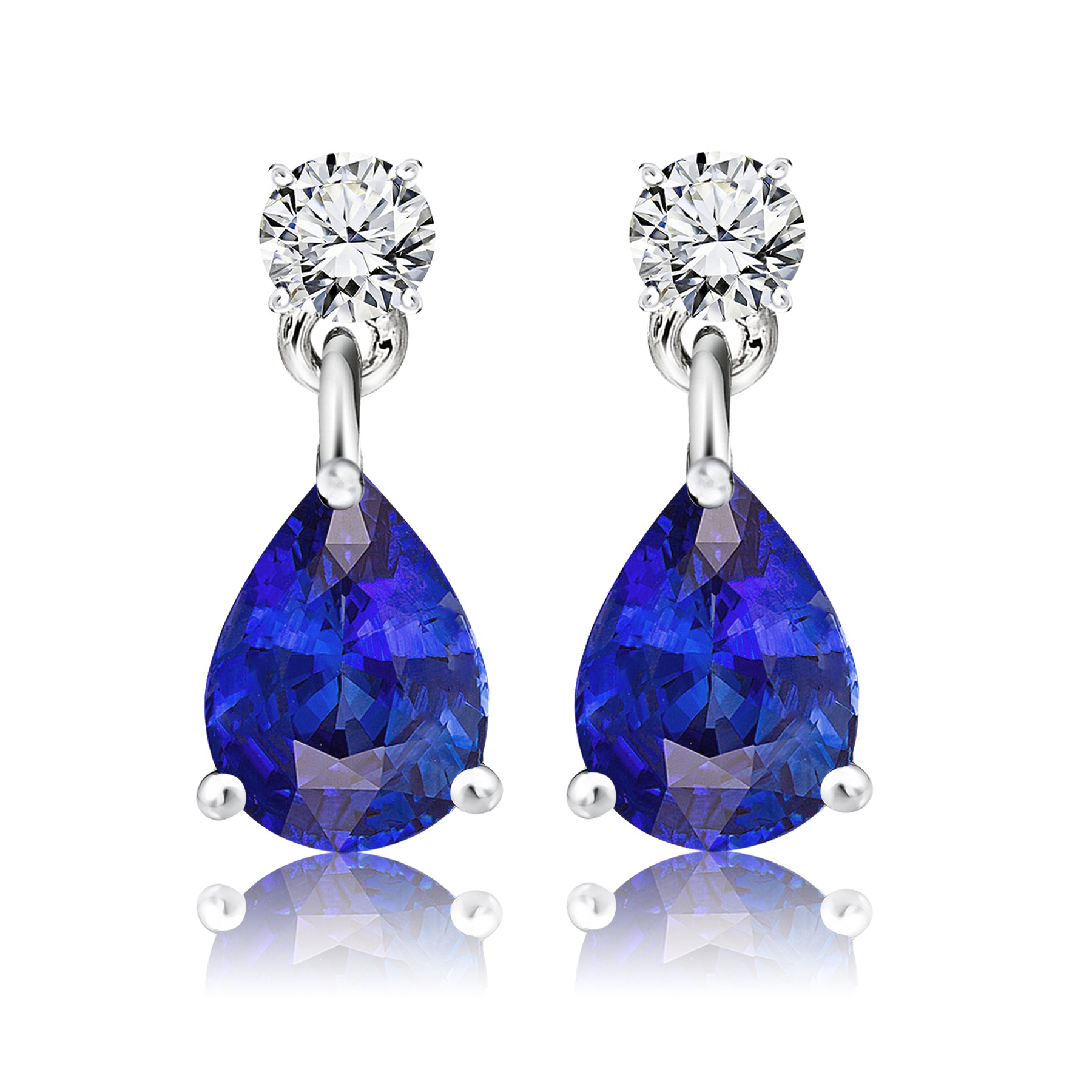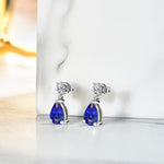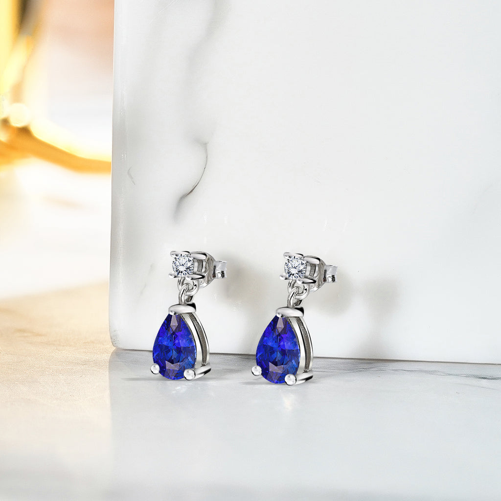 Classic 2.5 Carat Round and Pear Cut Dangle - Blue Sapphire - September Birthstone Earrings in 18k White Gold over Silver, Women