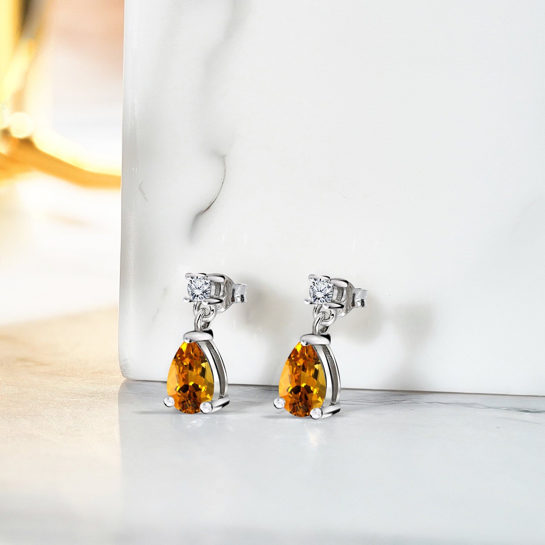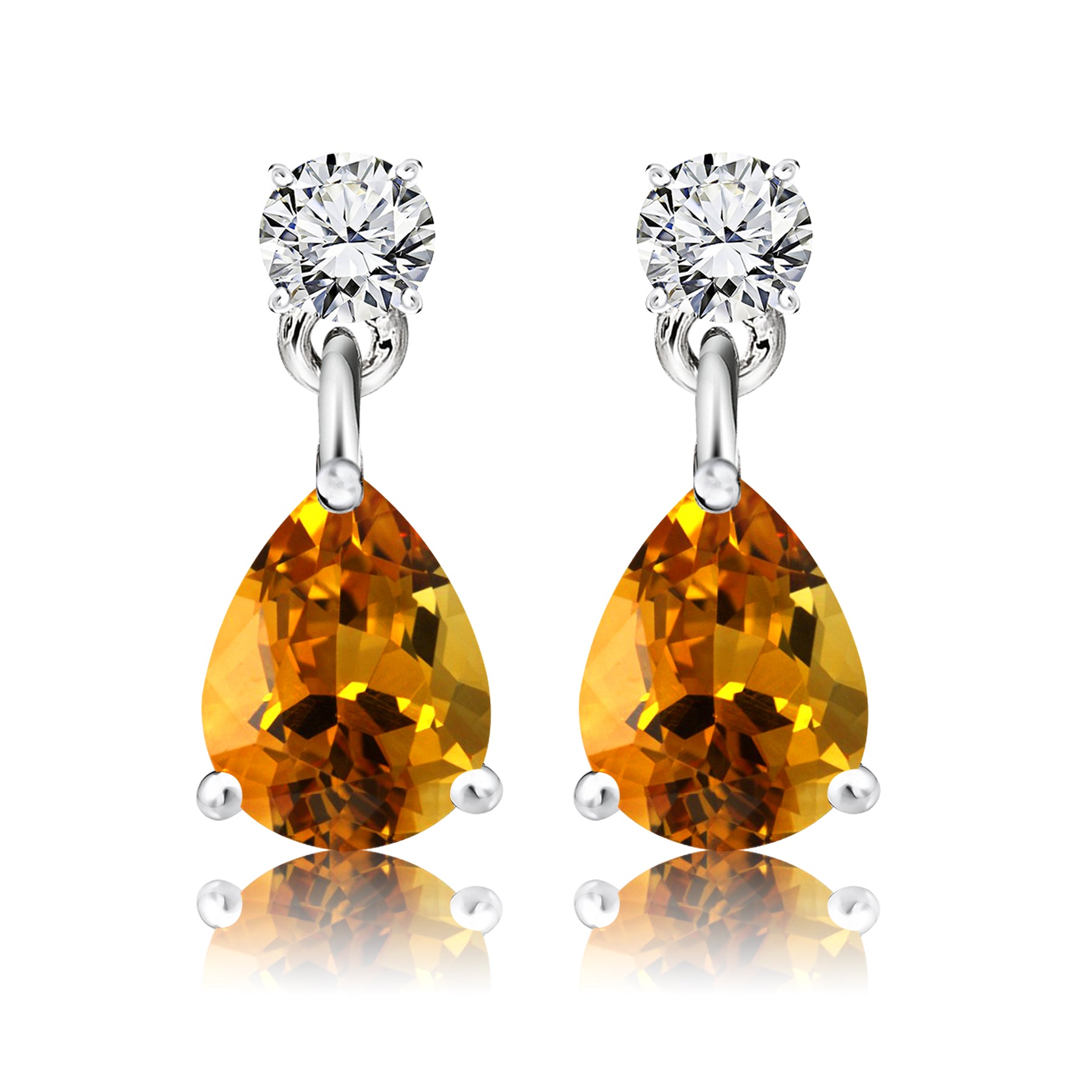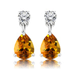 Classic 2.5 Carat Round and Pear Cut Dangle - Citrine - November Birthstone Earrings in 18k White Gold over Silver, Women