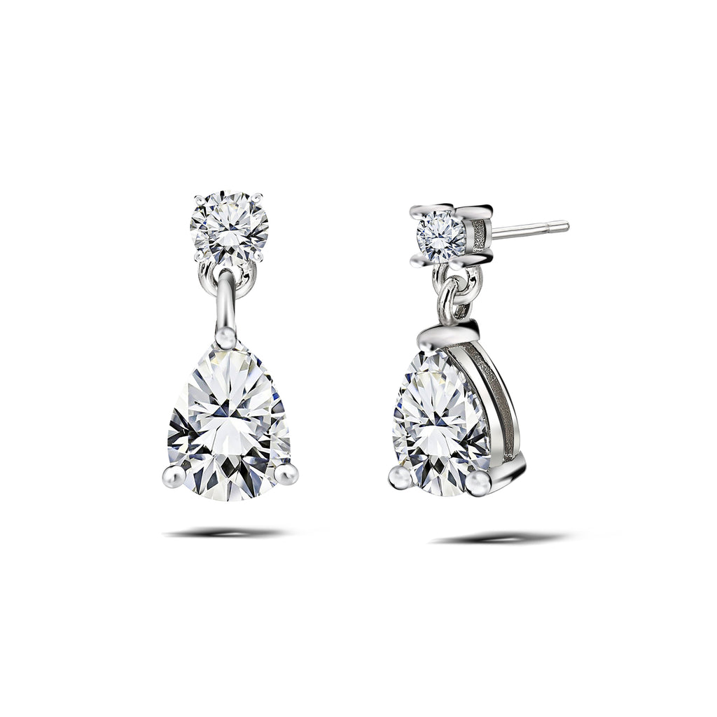 Classic 2.5 Carat Round and Pear Cut Dangle Moissanite Earrings in 18k White Gold over Silver, Women