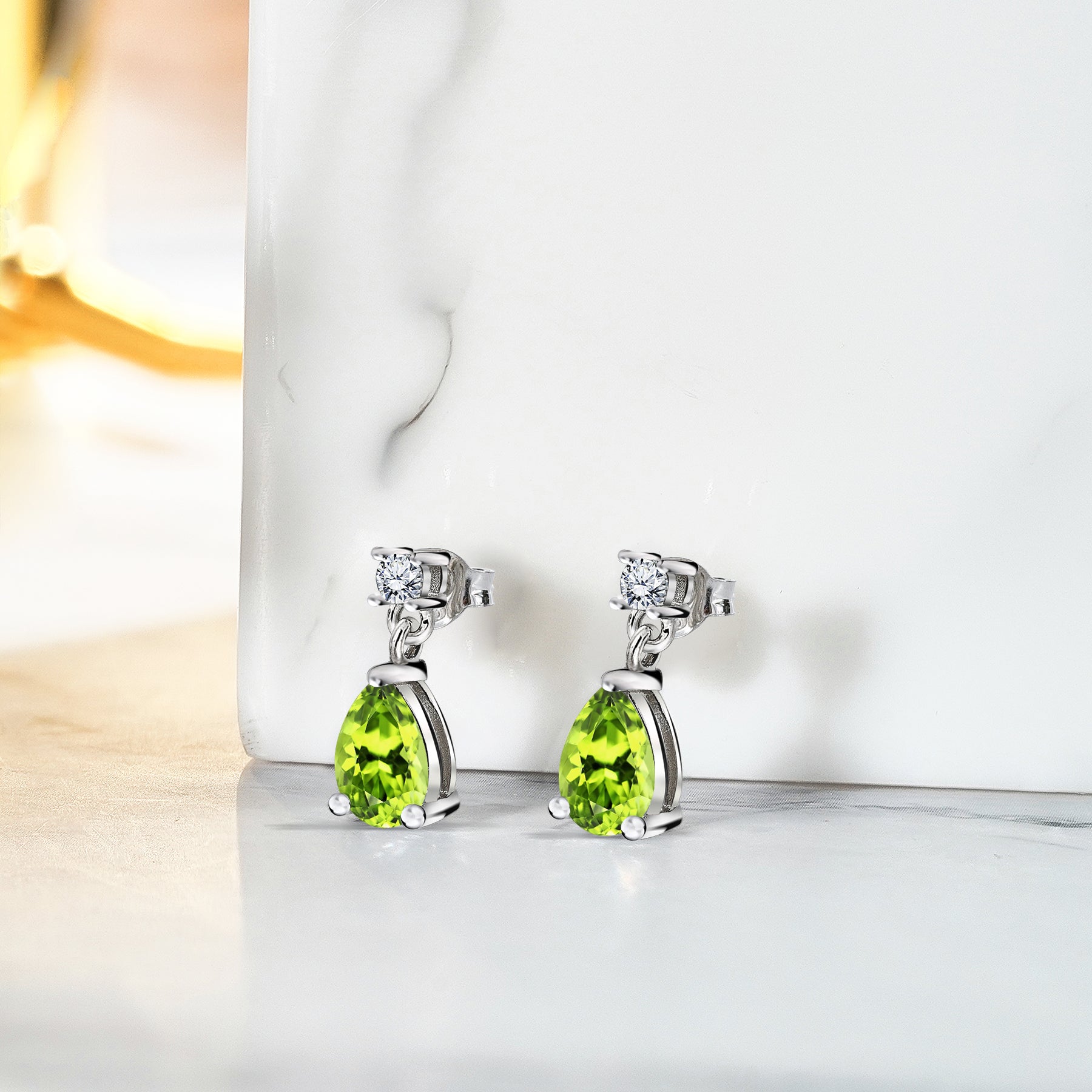 Classic 2.5 Carat Round and Pear Cut Dangle - Peridot - August Birthstone Earrings in 18k White Gold over Silver, Women
