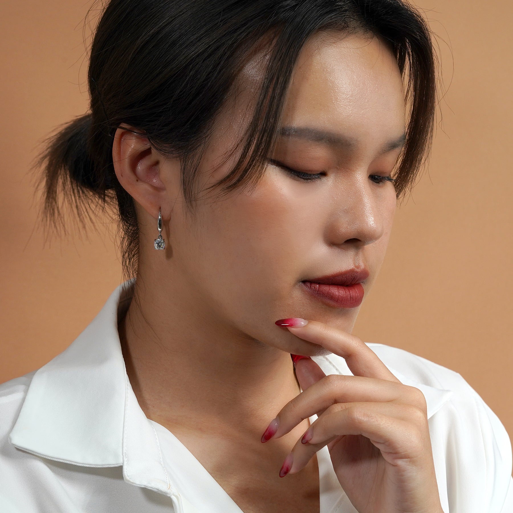 Immerse yourself in the world of affordable elegance with our Classic 2 Carat Cushion Cut Moissanite Dangle Earrings for Women in 18K White Gold over Silver. These enchanting dangle hoop earrings are designed to make a statement, featuring a total carat weight of 2 carats in 18K White Gold over Silver. With their delicate design, these moissanite dangle earrings sway gracefully with every movement, drawing attention and admiration. This pair of cushion cut earrings showcases a brilliant 1 carat cushion cut moissanite on each side, expertly faceted to maximize its brilliance and sparkle. In regards to comfort and safety, these moissanite leverback earrings can assure you they will never fall off your ears. Crafted with meticulous attention to detail, these dangle earrings are made with 18K white gold over silver, offering an expensive appearance at an inexpensive price. Not only do they exude timeless beauty, but they are also designed with affordability and durability in mind, making them truly an astounding pair of dangle earrings with stones. These unique dangle earrings are the epitome of versatility, perfect for a wide range of occasions. Whether it's a formal event, a romantic dinner, or a casual gathering, they effortlessly elevate any outfit, adding a touch of glamour and sophistication to your ensemble. Embrace the allure of the Classic 2 Carat Cushion Cut Moissanite Dangle Earrings for Women in 18K White Gold over Silver. This pair of 2 carat moissanite earrings are a perfect match for anyone.