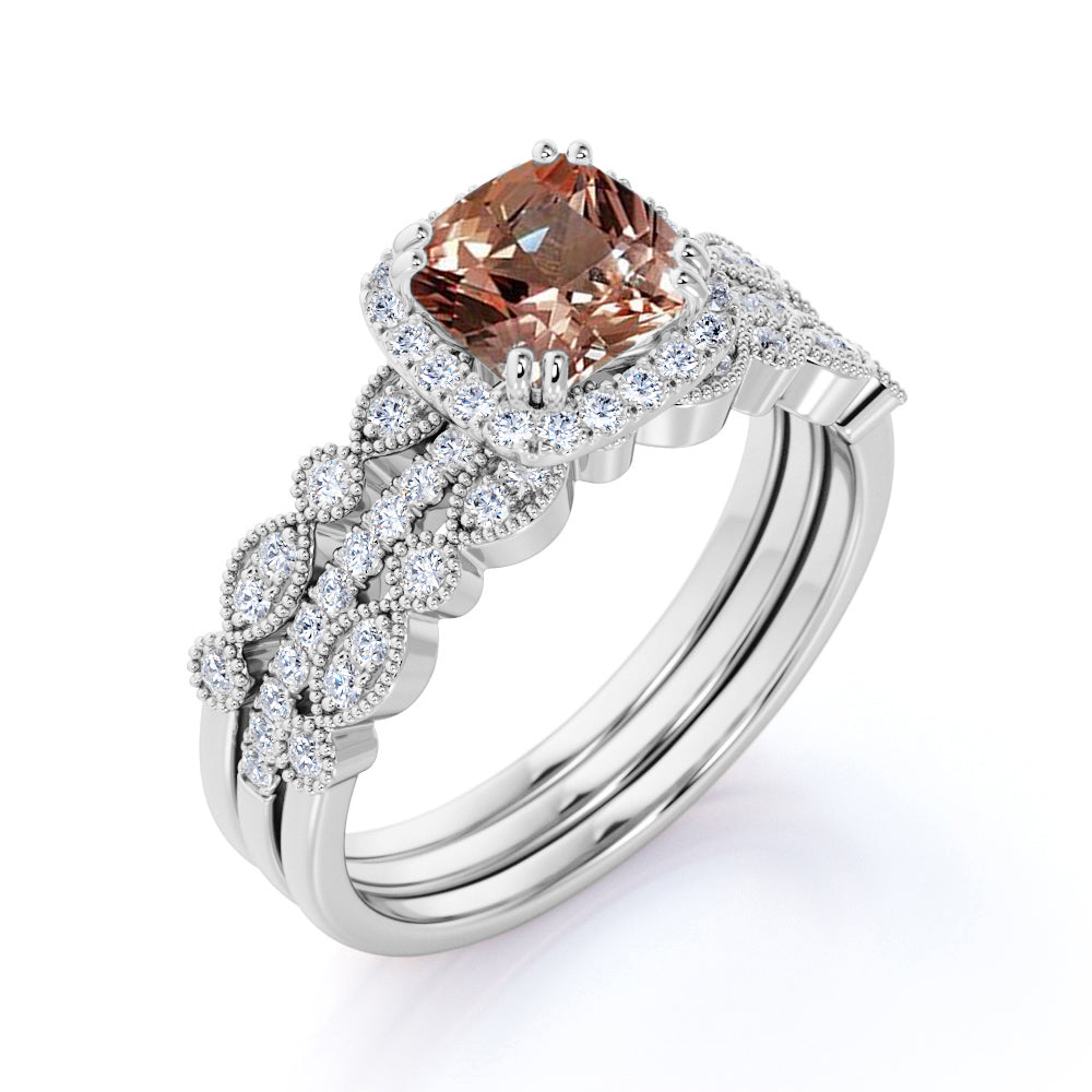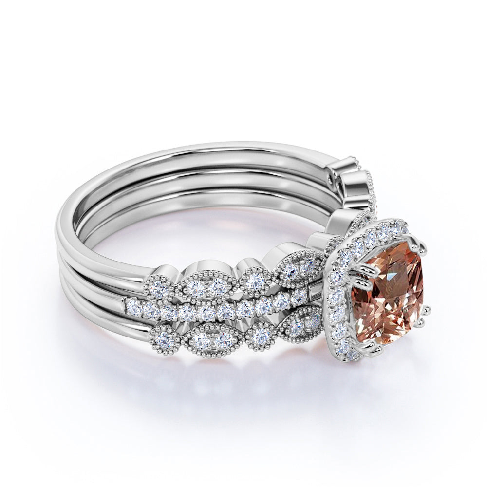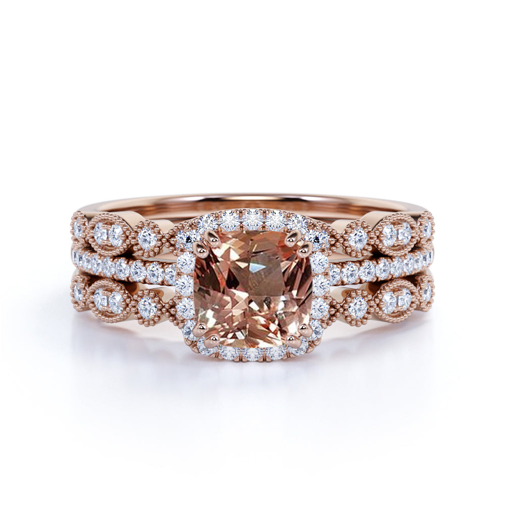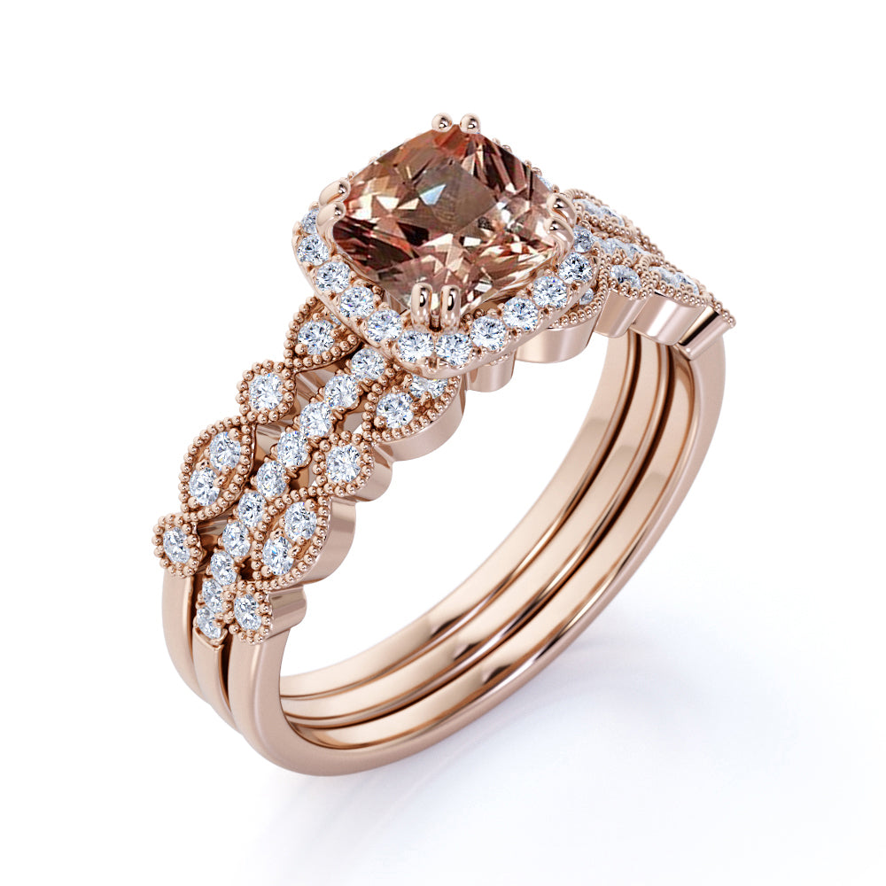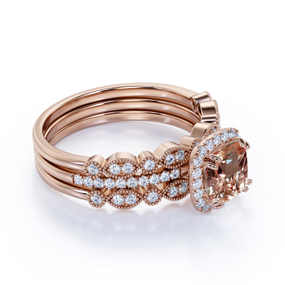Classic 2 Carat Cushion Cut Peach Morganite and Diamond Trio Wedding Ring Set in 10k Rose Gold Customized Ring