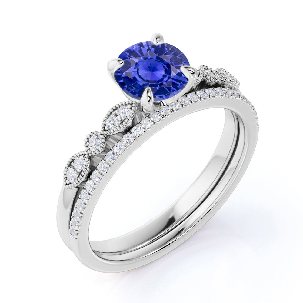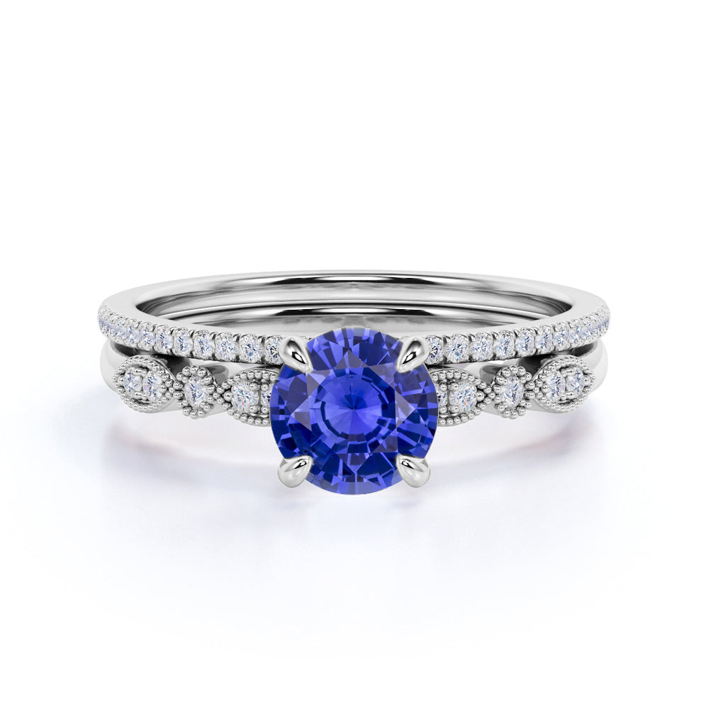 Classic 2 Carat Round Cut Sapphire and Diamond Bridal Ring Set with Pave Band in White Gold