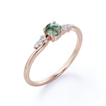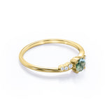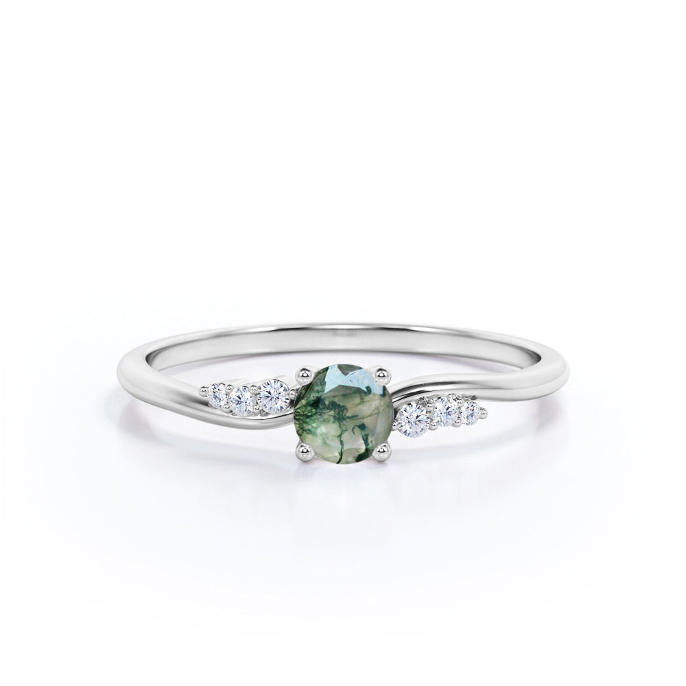 Celebrate the special occasion with this Classic 7 Stone Ring For Her - 0.55 carat Round Moss Agate and Moissanite Promise Ring in White Gold. The ring comes with a very simple design but it will look cute on her finger. Striking 0.5 carat round green agate stone is located in the center and flanked by tapered round Moissanite. The shank is curved like a small water wave and it will make you feel more relaxing; the curves on the left and right of the center stone are bent in different directions as well as the dwindled round Moissanite stones that are placed on the upper and lower part of the band. All of our green moss agate rings are authentic and cost effective. Every ring can be made in 18k gold over silver, 10k gold or 14k gold with the color options of white gold, rose gold, yellow gold and black gold.
