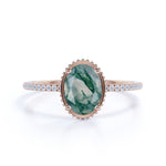 Classic Bezel Set 1.25 Carat Oval Cut Milky Finely Veined Moss Green Agate and Diamond Pave Engagement Ring in White Gold for Women