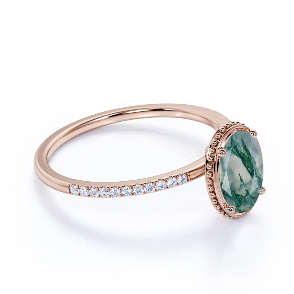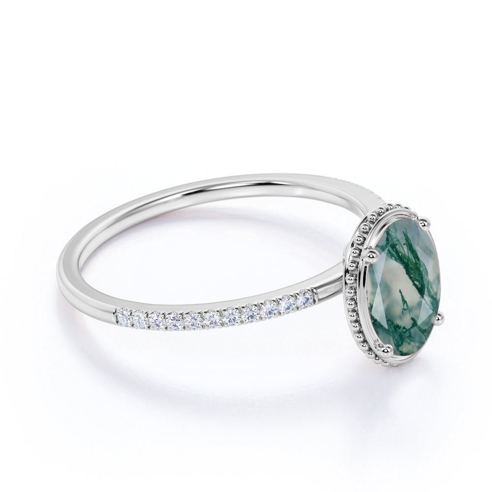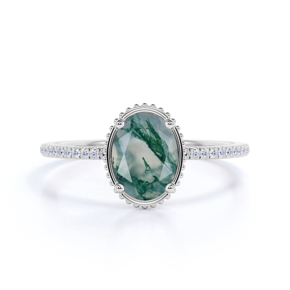Paint your love story with this Classic Bezel Set 1.25 Carat Oval Cut Milky Finely Veined Moss Green Agate and Diamond Pave Engagement Ring in White Gold for Women. This classic moss green agate engagement ring features 1 carat oval cut natural moss green agate and .25 carat real genuine side diamond for gold ring and moissanite for silver ring. This bezel pave moss green agate engagement ring can be customized to either 10k, 14K and Gold over Silver and either Black Gold, Rose Gold, White Gold or Yellow Gold. Also, as your satisfaction is our most priority, we will do our best to have your handmade jewelry be carefully and beautifully crafted by our expert jewelers. The order also comes with a 30-day full refund policy. This green colored minerals with banded inclusions ring will surely be a perfect gift for your special someone. It is believed to bring abundance in wealth and improve self-esteem. Encourage trust and hope with this real green Agate ring that shows a variety of white with green inclusions that resembles moss. Due to its unique milky white color with green dendritic inclusions, this vintage moss green Agate ring is sure to enchant its wearer. This moss green Agate ring is a very perfect alternative to those traditional ring. Create a fascinating look on your finger with this moss green Agate ring which is available in both solid gold and sterling silver. It perfectly fit those who are looking for a very unique ring that no two rings are alike. Crowned as a stone of power and wealth, this green Agate with mossy inclusions ring will attract abundance in all forms. Those who has a penchant for vintage and flawless ring would completely fall in love with this ring. Handcrafted with love, this antique ring will complement any style and enhance the charm of its wearer.